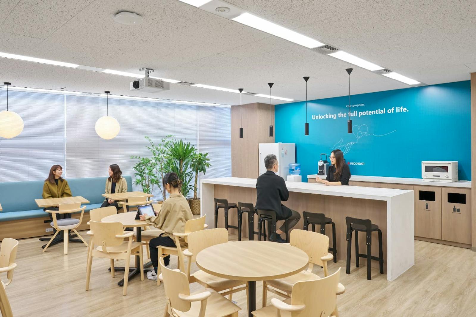 また、企業のパーパスである「Unlocking the full potential of life(人生の可能性を最大限に引き出す)」を壁面に掲げることで、理念を日常的に意識できる工夫も施されています。視覚的なメッセージが従業員の行動指針となり、空間全体で企業文化を体現した事例です。