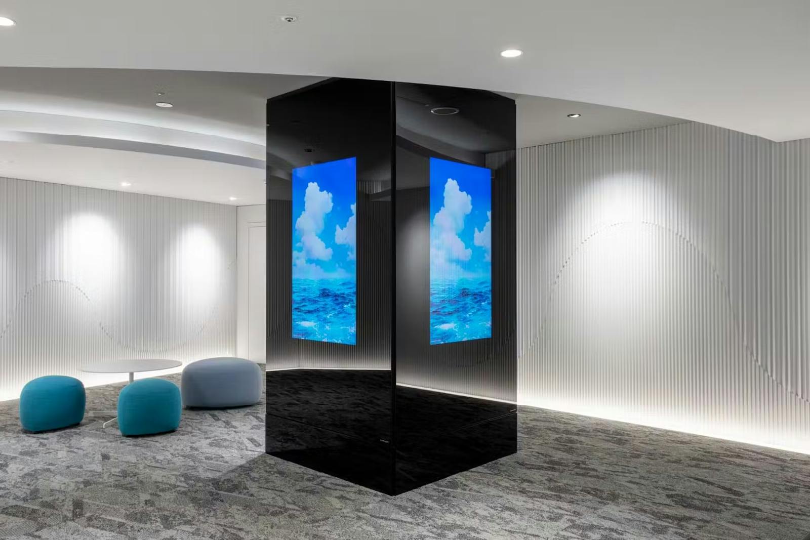 空間デザインには、「水」や「波」をモチーフにした柔らかな曲線と、白を基調とした透明感のある内装を採用。見学者には誠実な企業姿勢を印象づけるとともに、従業員にとっても心地よく働ける環境が整えられています。空間を通じてサービスの価値観を体現することで、インナーブランディングとアウターブランディングを同時に実現した好例です。