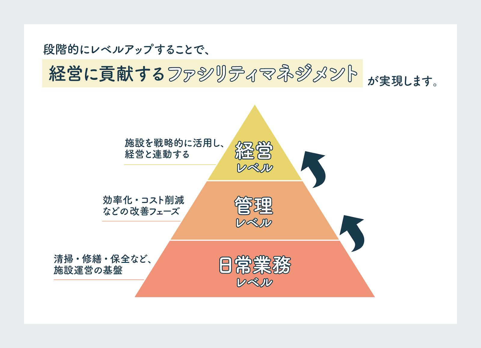 この3つのレベルは、ピラミッドのように下位が上位の土台となっています。例えば、日常業務レベルの清掃や修繕といった基本が整っていなければ、効率化や低コスト化の施策を行う管理レベルに進むことはできません。自社がどのレベルにあるかを確認し、次に目指すべき段階を意識して進めていくことが、ファシリティマネジメントの実現につながります。