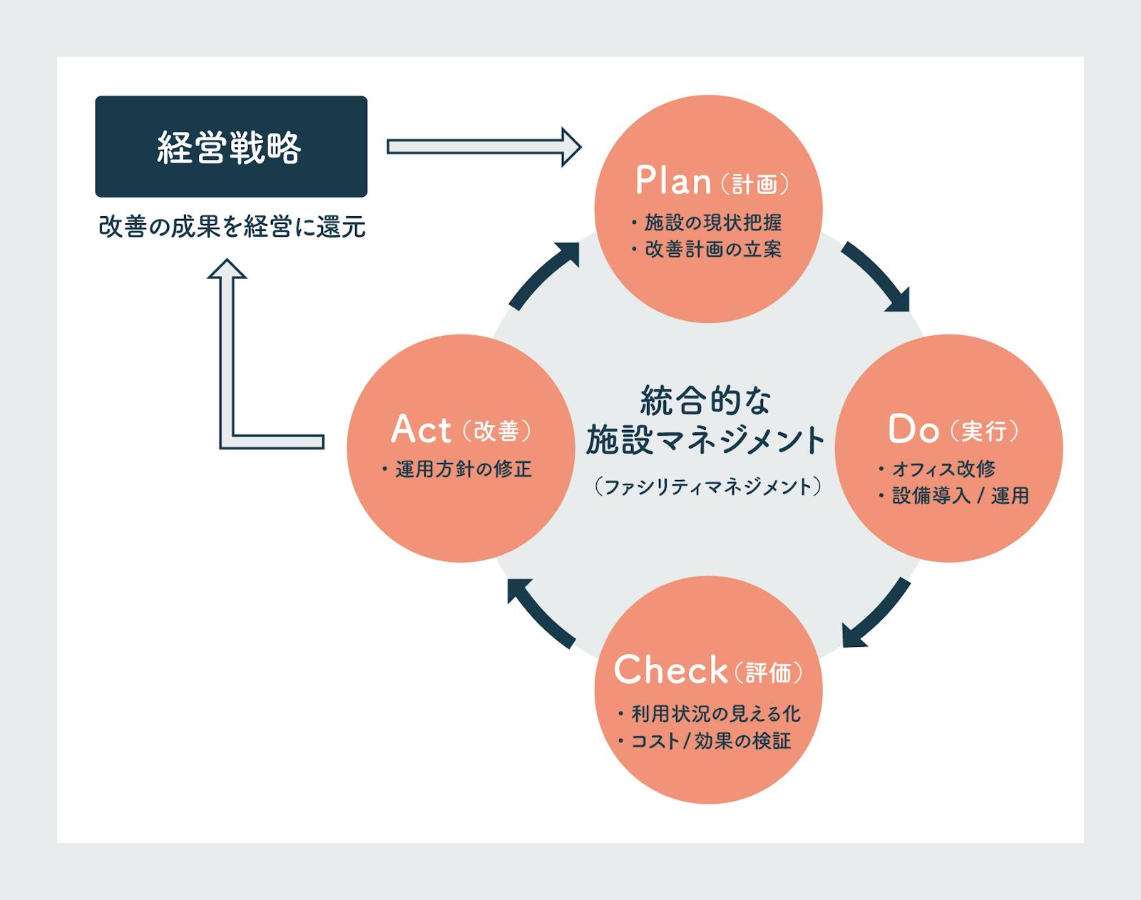 - Plan(計画):経営戦略にもとづいて、施設や設備をどう活用・改善するかを計画する