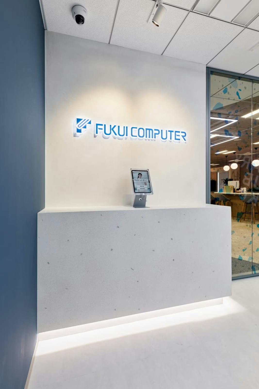 福井コンピュータホールディングス株式会社 様のエントランスは、コーポレートカラーであるブルーを基調に、ブランドメッセージを力強く伝えるデザインが特徴です。壁面には「VISIONARY HUB FUKUI」の大きな文字が描かれており、福井という地域とともに未来を見据えた企業姿勢を表現しています。