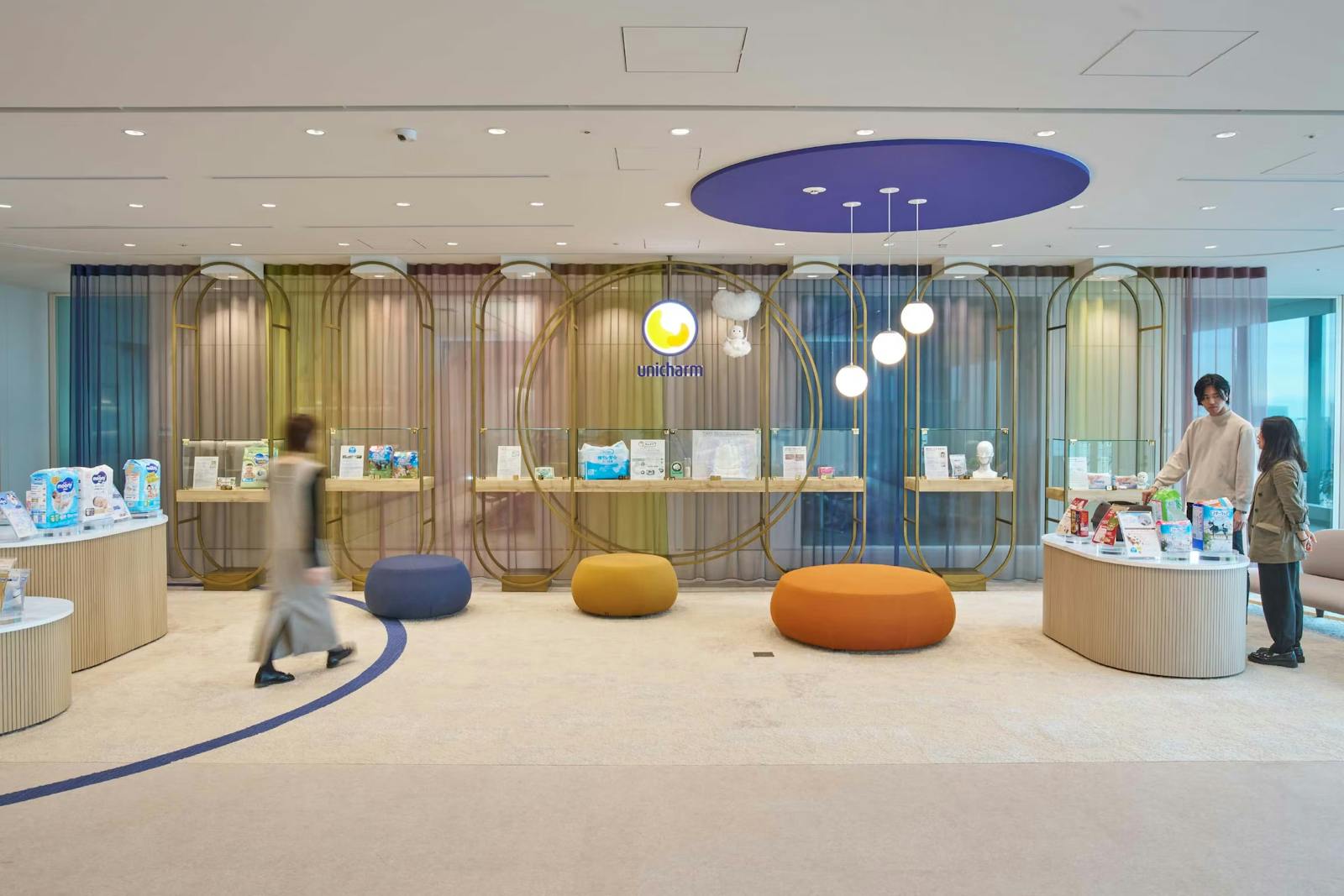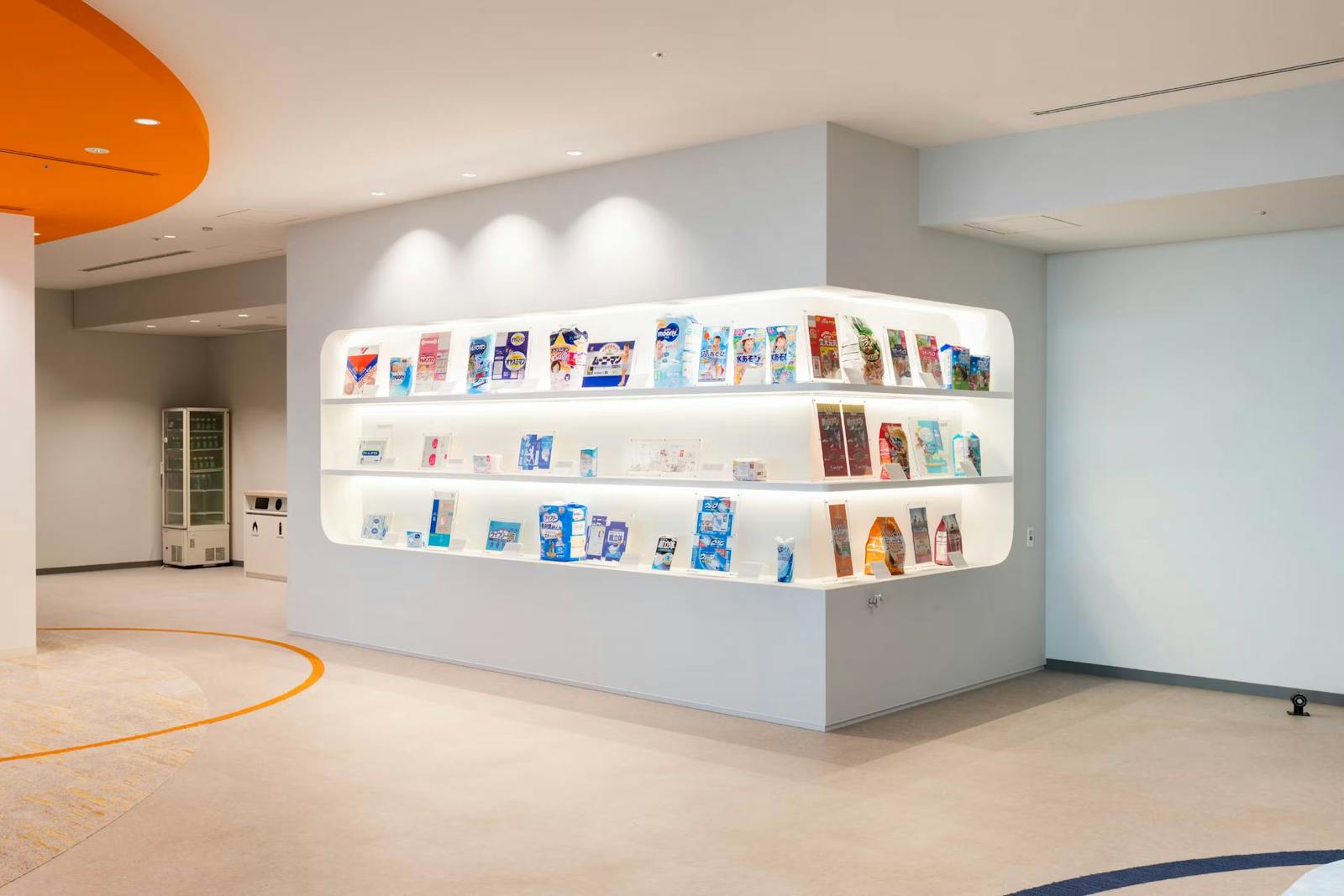 来客エリアには、ユニ・チャームのこれまでの取り組みを伝える展示スペースを設置。初代製品から最新パッケージまでを展示することで、企業の歴史や革新性を視覚的に伝えています。展示スペースのデザインも印象的で、訪れる人に安心感を与えるとともに、ブランドの世界観を自然と感じさせる空間となっています。