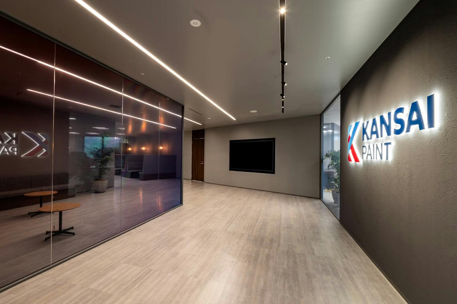 関西ペイント株式会社 様のエントランスは、自社製品を前面に押し出したギャラリー形式のデザインが特徴です。マットで高級感のあるグレーの壁には、同社製の塗料が使用されており、訪問客に品質を直接訴求する設計となっています。ガラスパネルの仕切りは、青から赤へのグラデーションが施され、視覚的なアクセントとなるとともに、塗料の多様性と技術力を表現しています。