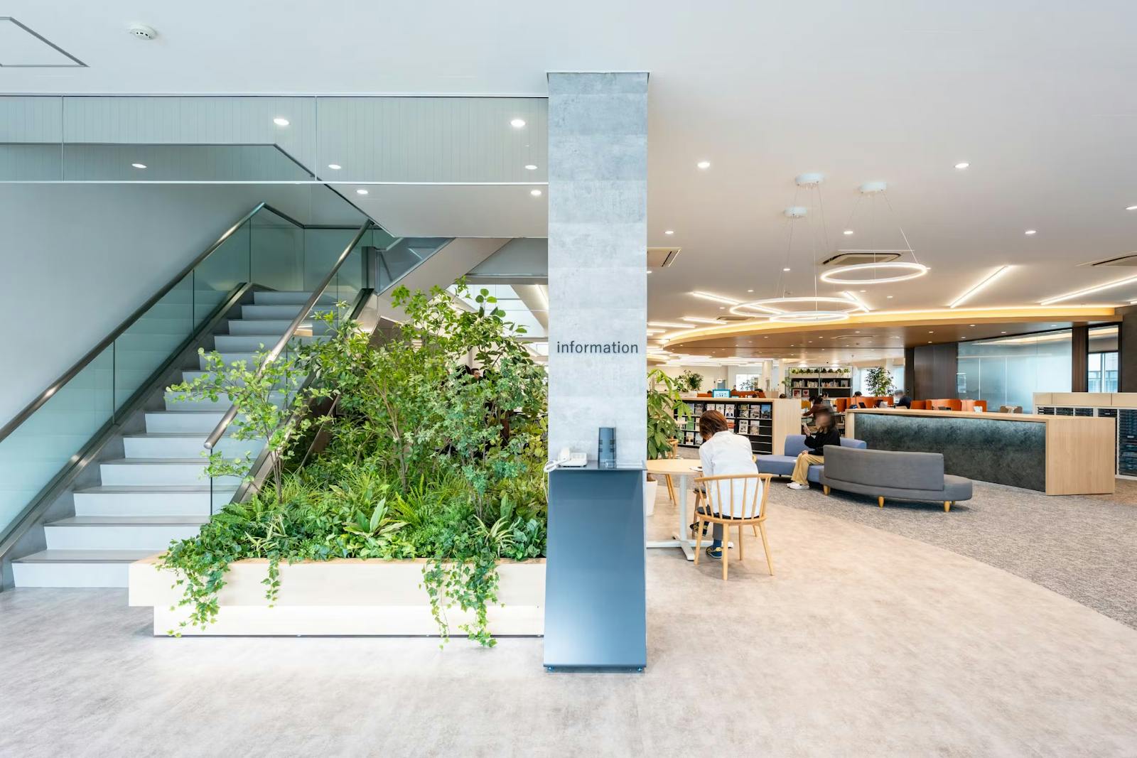 植栽を囲むベンチも設けられており、ちょっとした打ち合わせや会話がしやすい空間としても機能。開放感と機能性が両立した、心地よいエントランスです。