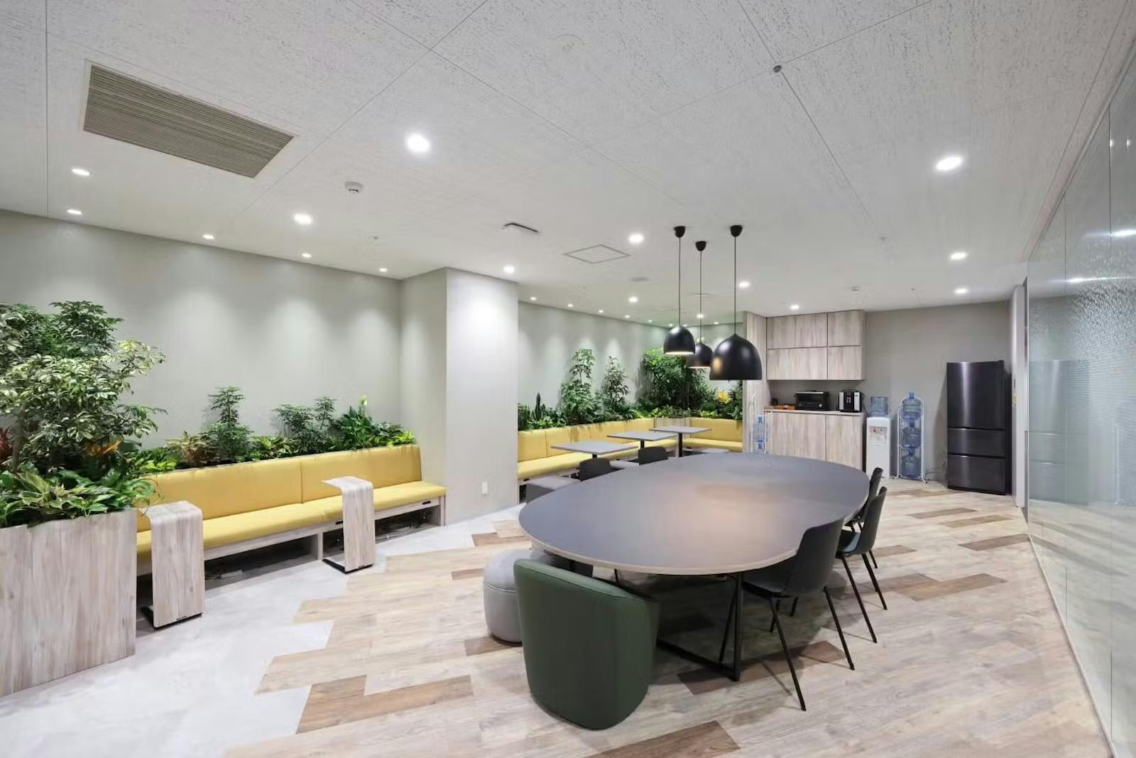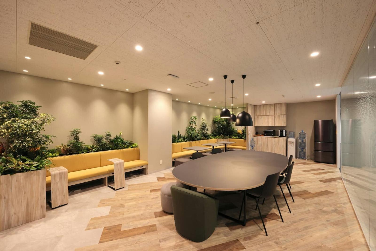 株式会社YEデジタル 様では、窓のないオフィス内でも自然の光を感じられるように、照明による工夫が凝らされたリフレッシュスペースを設けています。特徴的なのが、5段階の色味調整と121種類のカラー演出を可能にした照明です。これにより、生木の育成に必要な光を再現するとともに、朝・昼・夕といった時間帯の変化を光で演出し、社員の体内リズムの調整にもつながっています。業務から一時的に離れて心身を整える空間として、照明が大きな役割を果たしています。