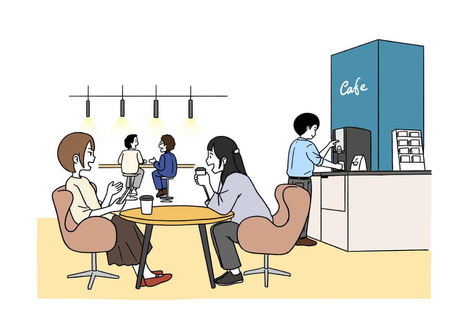 カフェ設備があることで、ラウンジは気軽に立ち寄れる休憩スペースとしての機能が高まります。コーヒーやお茶などの飲み物を自由に楽しめる環境は、社員のリフレッシュを促すだけでなく、自然な交流や雑談のきっかけになるでしょう。