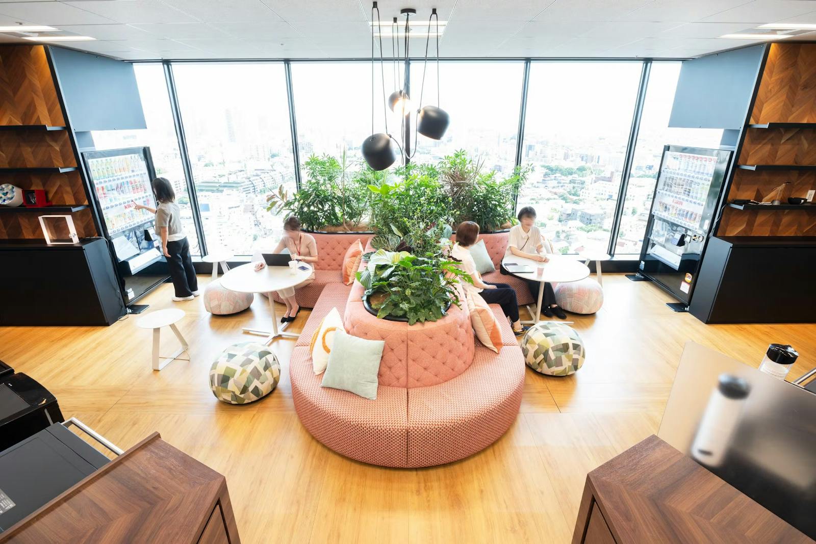 各フロアには異なるテーマとデザインが施されており、例えば16Fのラウンジは、グリーンを基調とした空間が特徴です。青葉が垂れ下がるやぐら風の小上がりが設けられ、業務の合間にくつろぐ社員の姿が見られます。