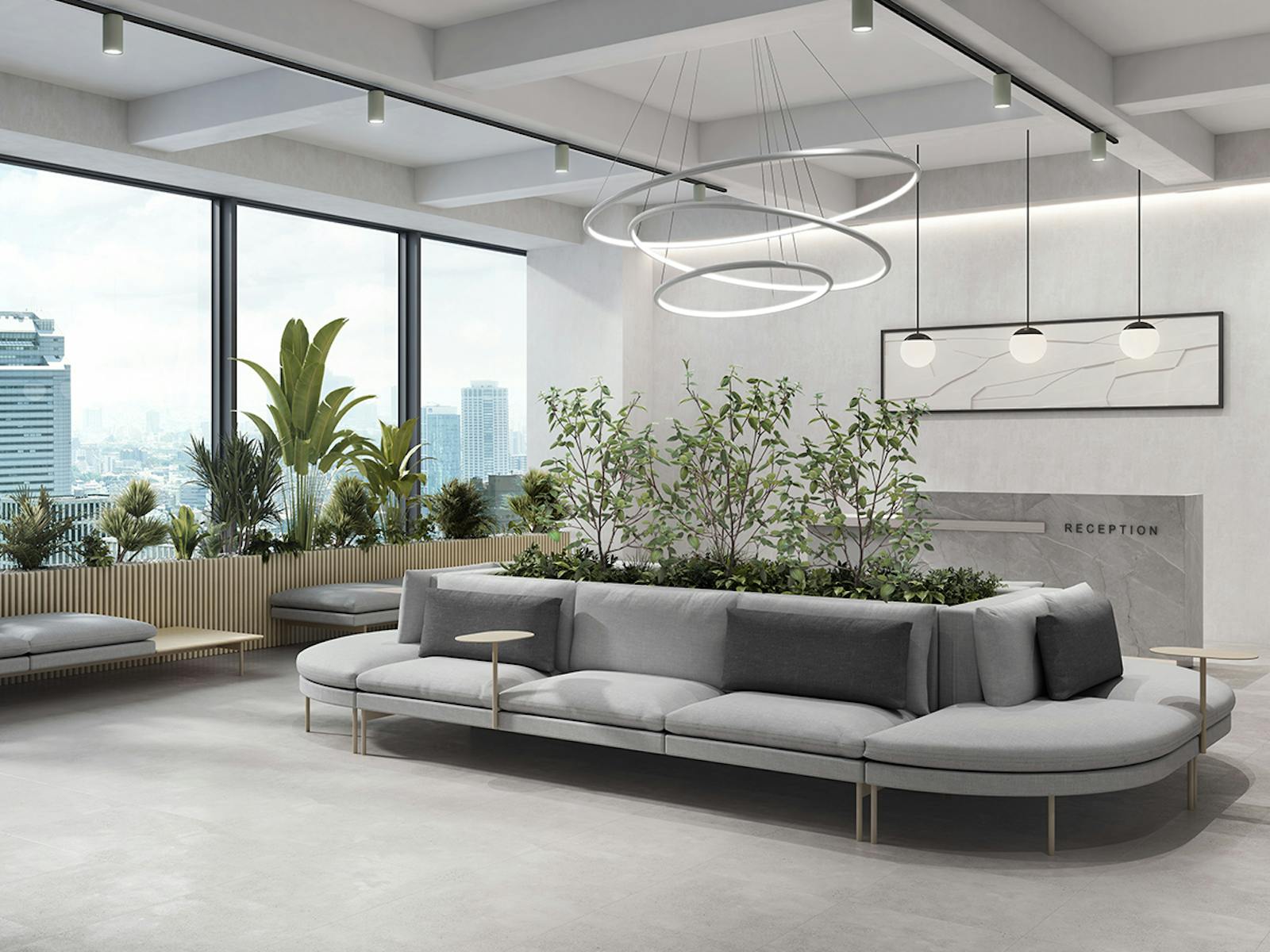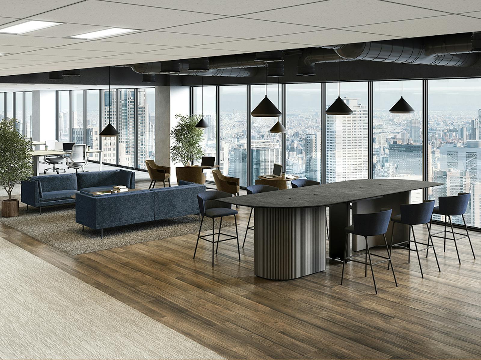A:オフィスラウンジとは、社員の休憩やリフレッシュだけでなく、集中作業や打ち合わせ、社員同士のコミュニケーションなど、さまざまな目的に活用できる共有スペースのことを指します。ソファやカフェ風のテーブルなどリラックスできる家具が置かれたホテルや空港のラウンジのような雰囲気が特徴です。心地よさと実用性を兼ね備えており、業務の一部としても自然に機能する空間として、多くの企業で導入されています。