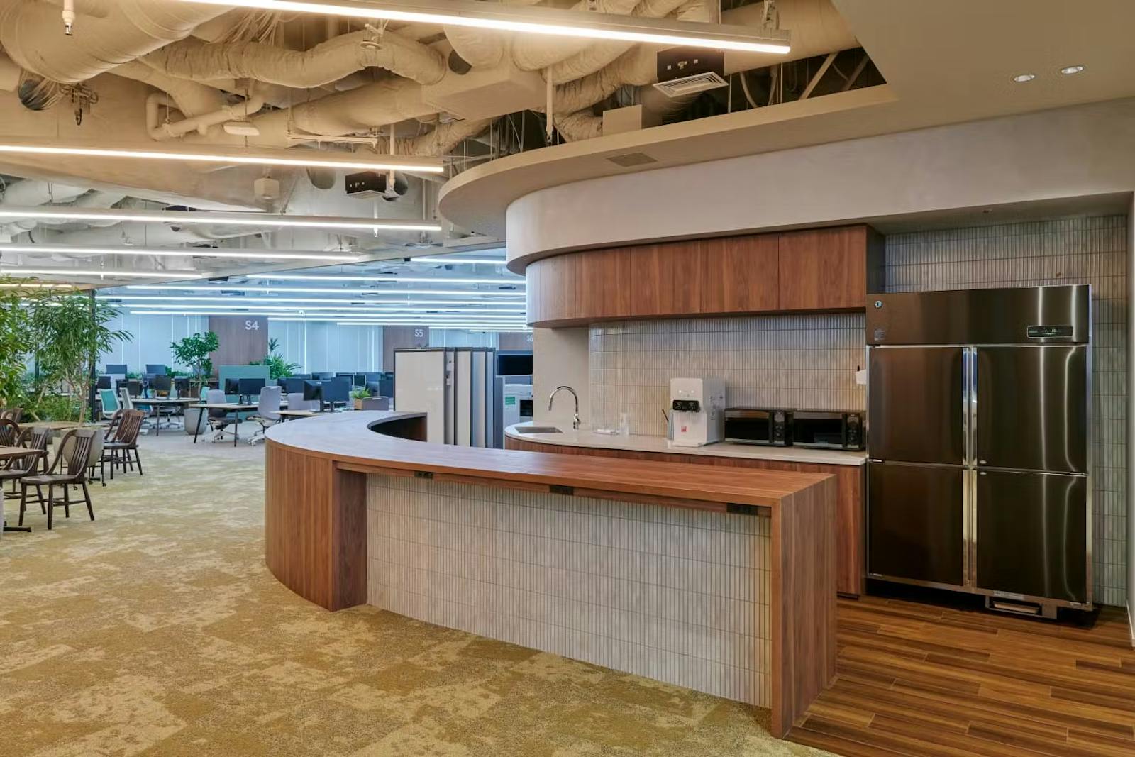 さらに、併設されたカフェエリアに設置された曲線のある特徴的なパントリーには、レンジやコーヒーマシンなどが設置されています。社員が昼食を取ったり、気軽に飲み物を楽しんだり、イベント時にはケータリング提供の場としても活用可能です。