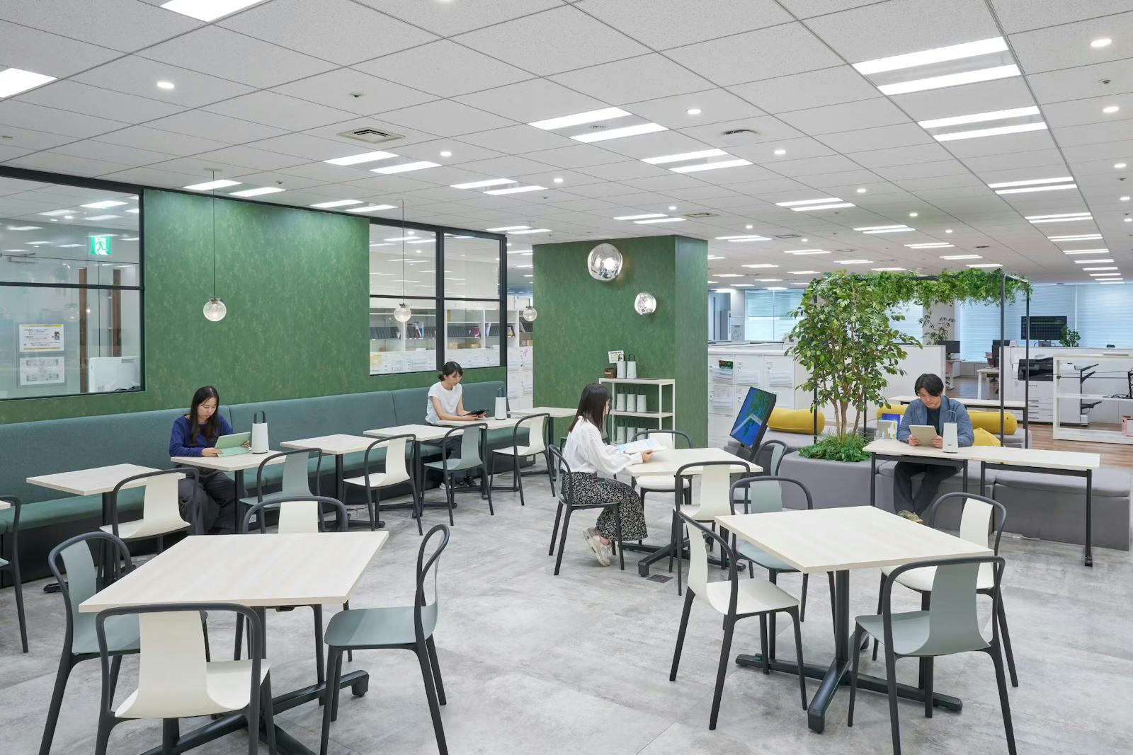 カジュアルな打ち合わせや休憩、外出の多い社員が立ち寄って作業する場としてはもちろん、社内イベントやプレゼンテーションに活用され、自然な交流やチームを越えたコラボレーションを促す場となっています。