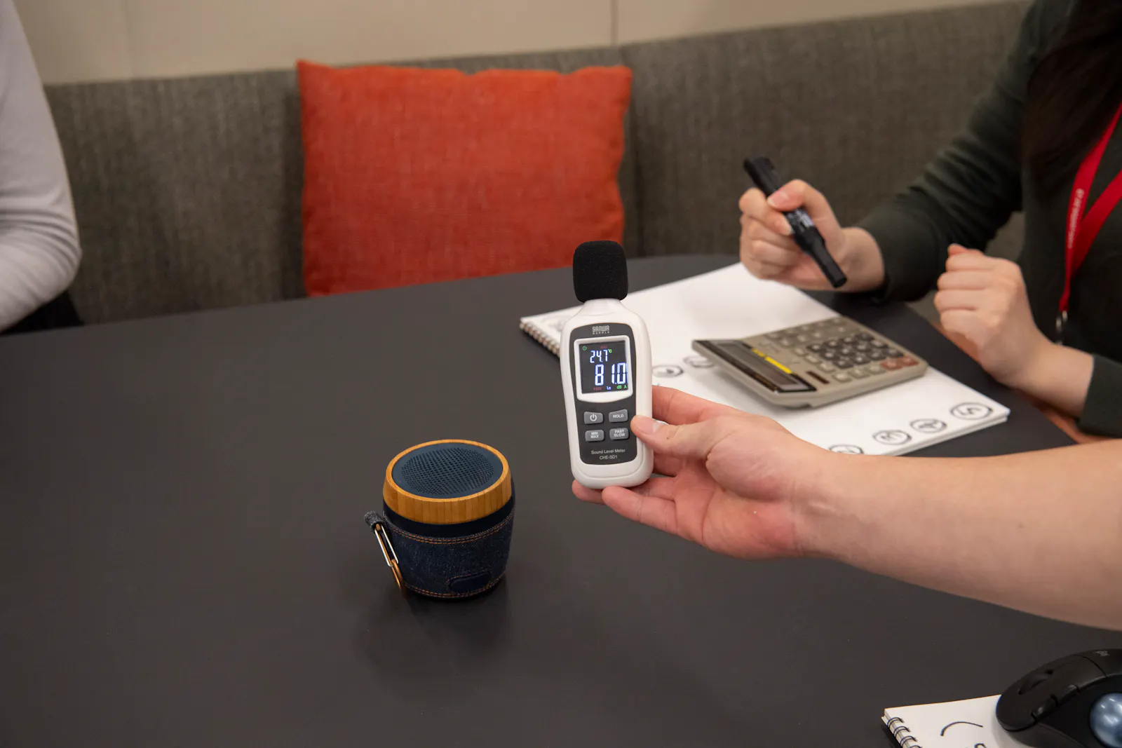 次に、オフィスでも使用されることの多い外付けスピーカーマイクを使用して検証していきます。検証1と同様に、静かな会議室にいる出題者が問題を読み上げていきます。