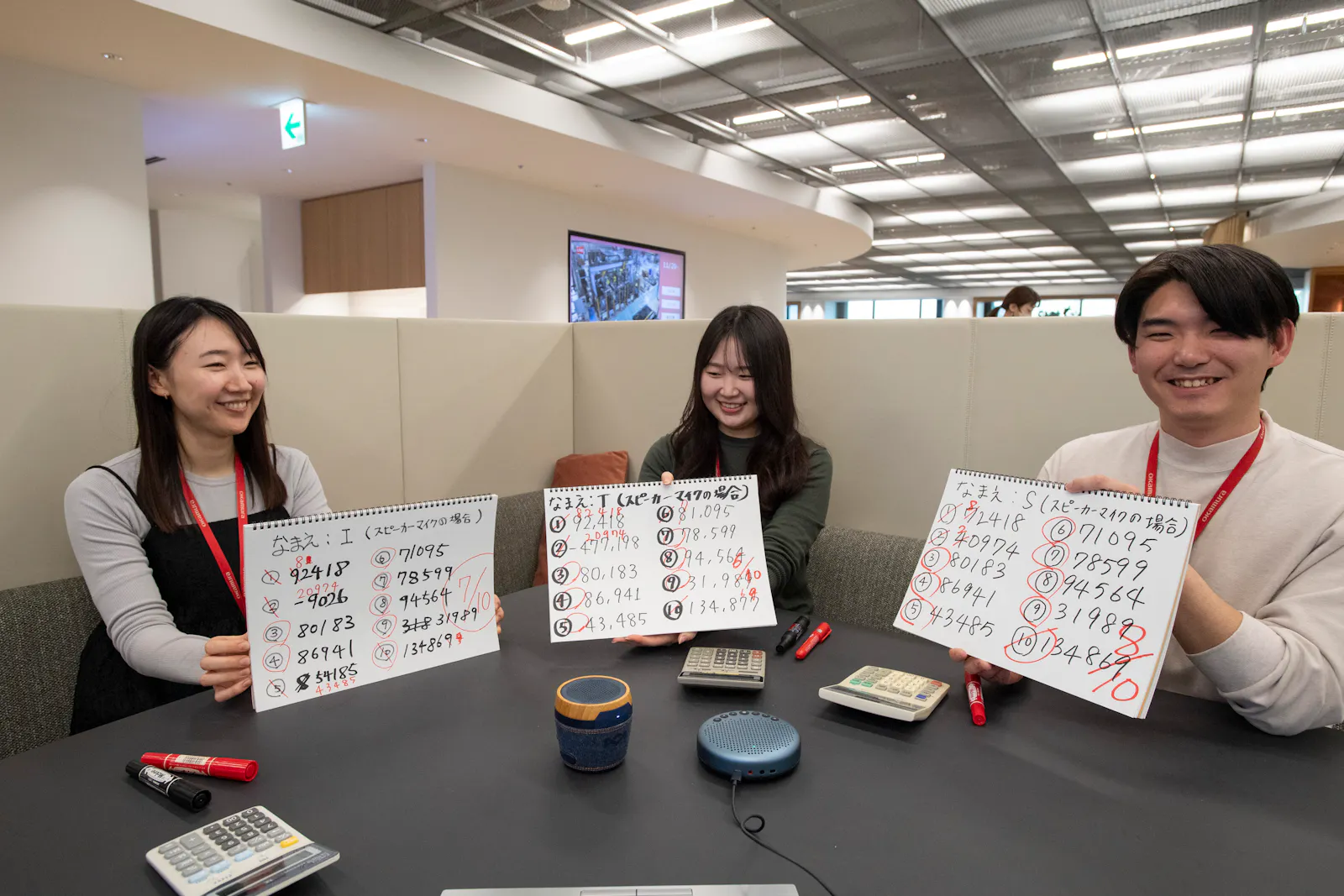 オカムラの社員3名が、実際にWEB会議で使用できる3つの音響機器をそれぞれ検証していきます。今回の検証では、コモリくんたちとの会議を受けて、「会議中に大事な数字の話をする」シーンを想定し、数字の正しい聞き取りを検証することにしました。
