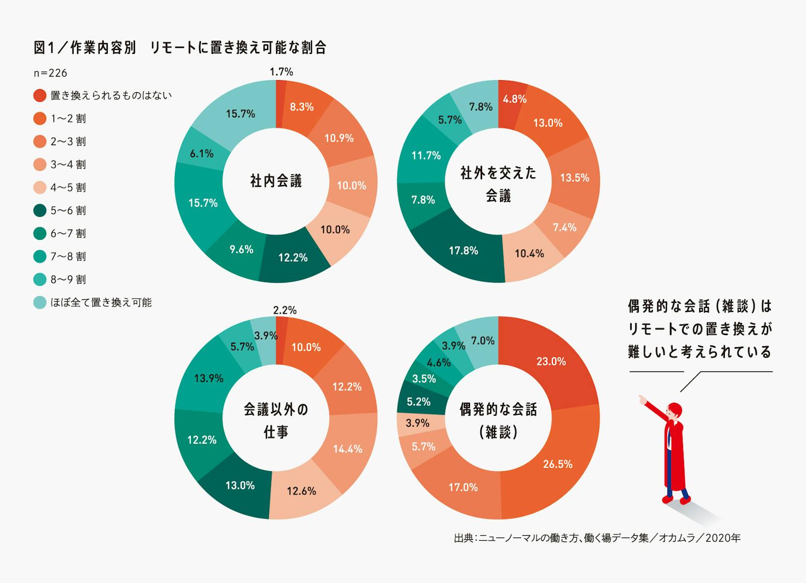 これからの時代は対面のオフィスワークとリモートワークのバランスを意識しながら働くことが求められます。では、私たちの仕事はどれくらいの割合をリモートワークに置き換えることが可能になるのでしょうか。オカムラが14社のワーカー282名に行ったアンケート結果では、「社内会議の半数以上をリモートに置き換え可能」と答えている人が過半数いました。同様に「社外を交えた会議」や「会議以外の仕事」についても過半数近くの人が「5割以上置き換え可能」と答えています。