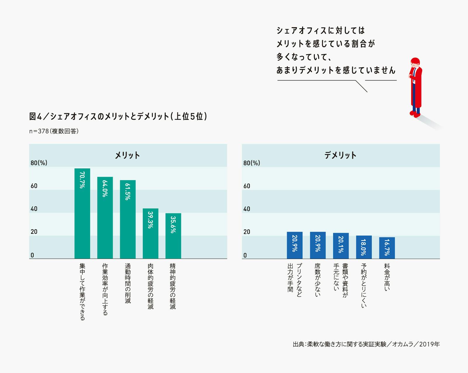 デメリットとしてはどの項目もそれほど高い値を示していませんが、オフィスと違い、必ずしも機器類が揃っているわけでもないため「プリンタなど出力ができない」という意見や「席数が少ない」といった意見があがりました。