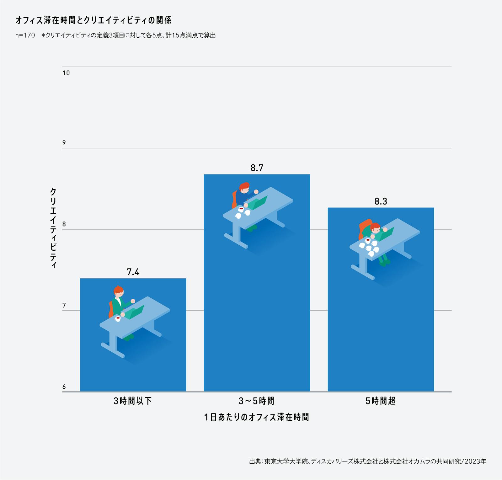 オフィスに出社した際の1日当たりの滞在時間について、対象者数がおおよそ均等になるように3つのグループに分けると、3〜5時間程度のグループのクリエイティビティが最も高いことがわかりました。