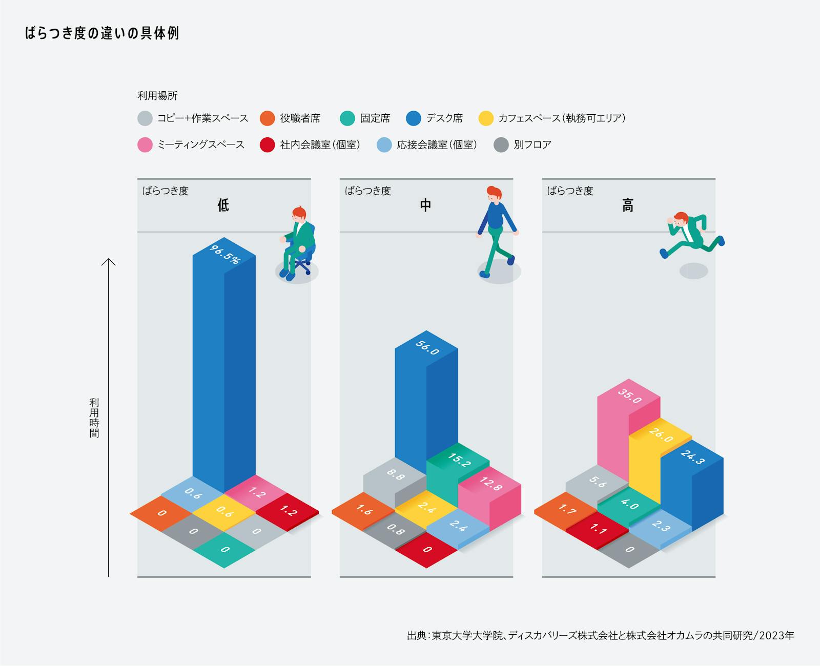 前述の利用場所のばらつき度については、経済学で用いられる手法を参考に、各ワーカーのオフィスの利用場所ごとの利用時間割合から算出しました。