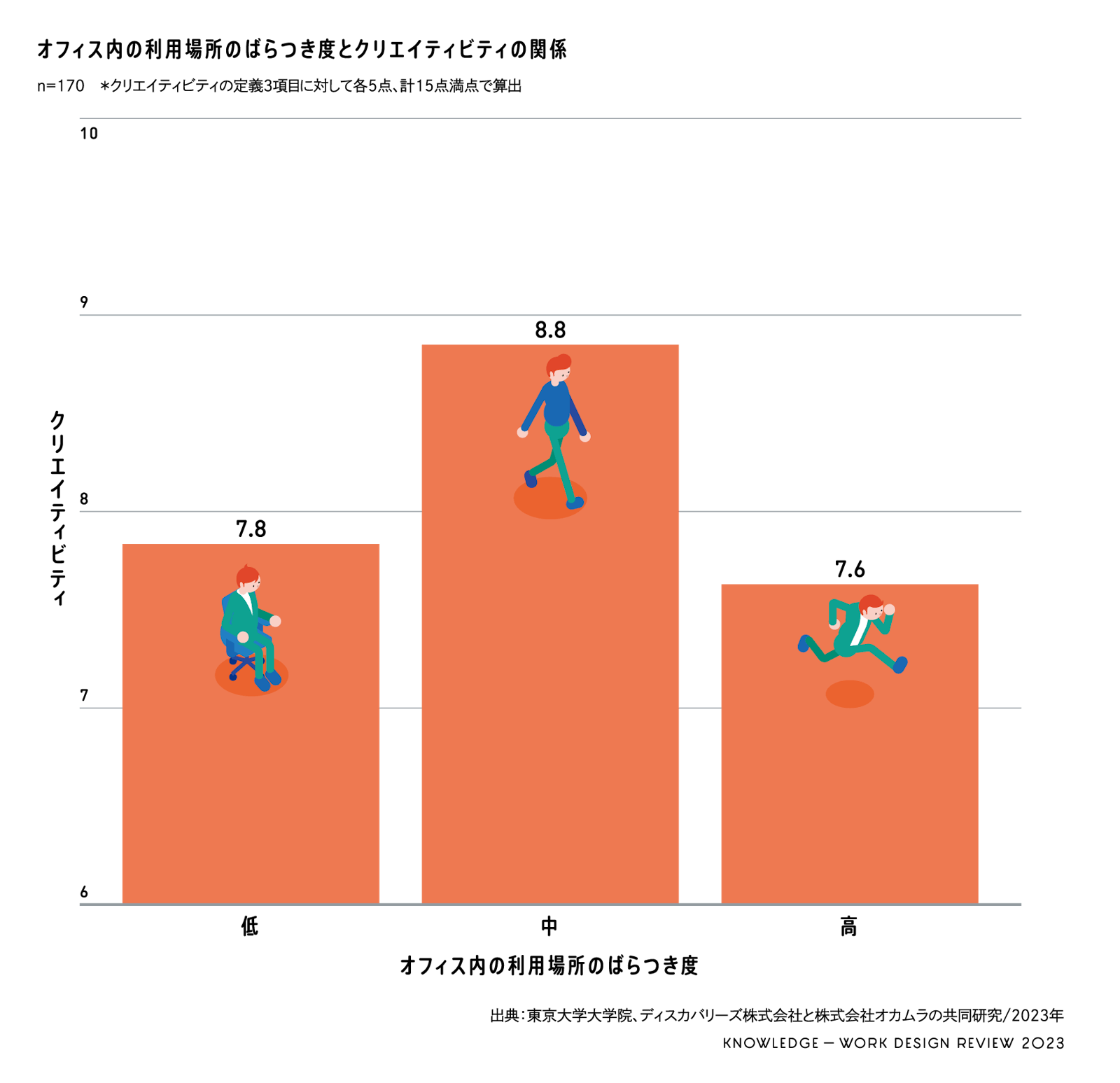 オフィスに出社した際の利用場所のばらつき度によって対象者数をほぼ均等になるように3つのグループに分けると、利用場所が適度(中程度)にばらついているグループのクリエイティビティが最も高いことがわかりました。