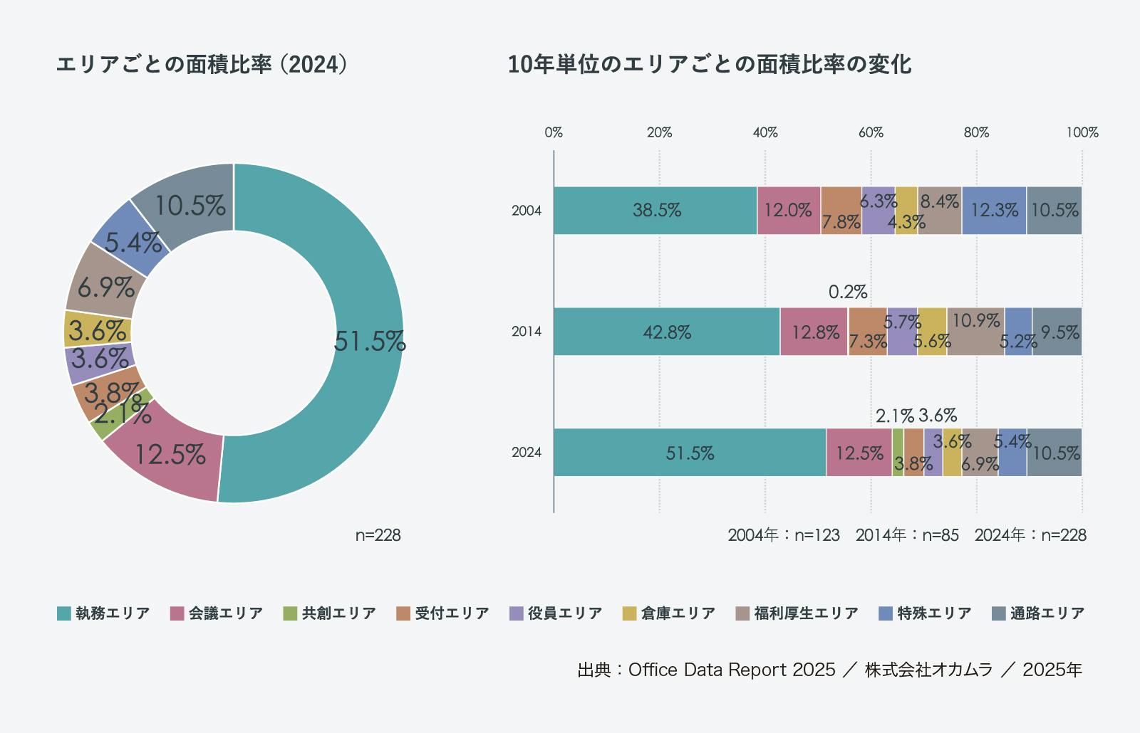このレポートでは、オフィス全体を9つのエリアに分け、その面積を計測しています。エリアごとの面積比率を見ると、オフィスの約半分は執務エリアが占めています。また、10年ごとの変化を見ると、執務エリアは徐々に増加し、受付エリアや特殊エリアの比率は減少していることがわかりました。