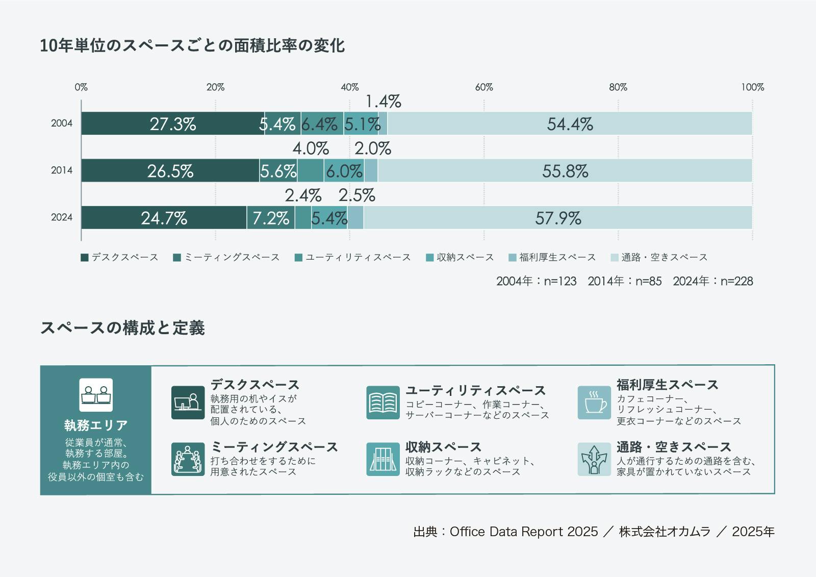最新のトレンドやこれまでの変化などオフィスづくりにかかわる基本的なデータを、「Office Data Report 2025」に掲載しました。こちらの記事ではその中から特にポイントとなるものを抜粋してご紹介します。