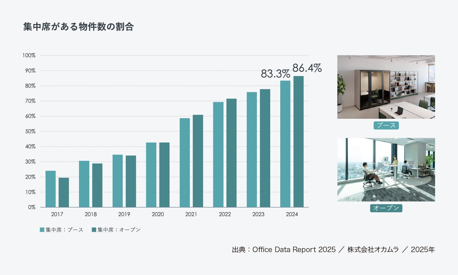 執務エリア内には、集中して作業を行うための集中席を採用するオフィスが増えているようです。ここでは集中席を、パネルなどで囲まれたクローズな環境にある『ブースタイプ』と窓際などオープンな環境にある『オープンタイプ』の2種類に分けて調査しています。集中席を有する物件の割合の変化を調べたところ、どちらも顕著に増加の傾向が見られました。2024年にはどちらのタイプも8割以上になり、年々、集中席をオフィスに設ける考えが広がってきていることがわかります。