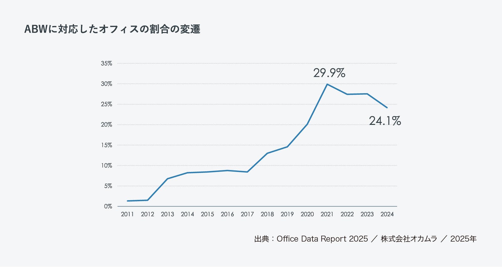 ABWとはActivity Based Workingの略で、仕事の内容や目的に合わせて働く場所を選択する働き方を意味します。このレポートでは、図面上に執務できる場所の選択肢がどれだけあるかを見て、ABWに対応したオフィスかどうかを判断しています。ABWに対応したオフィスの割合の変遷を見ると、2017年以降は上昇傾向が顕著でしたが、2021年の29.9%をピークに減少傾向となり、2024年は24.1%となりました。