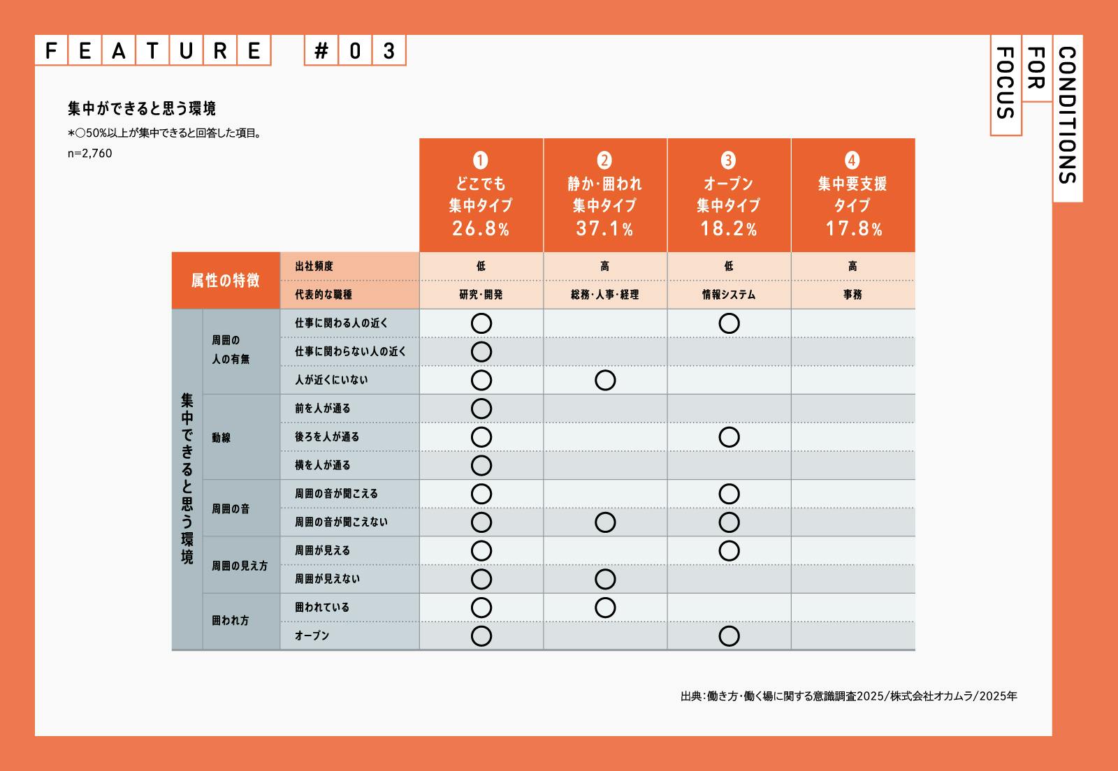 オフィスワーカーの集中の実態を探り、必要とされるオフィスの環境について調査をしました。