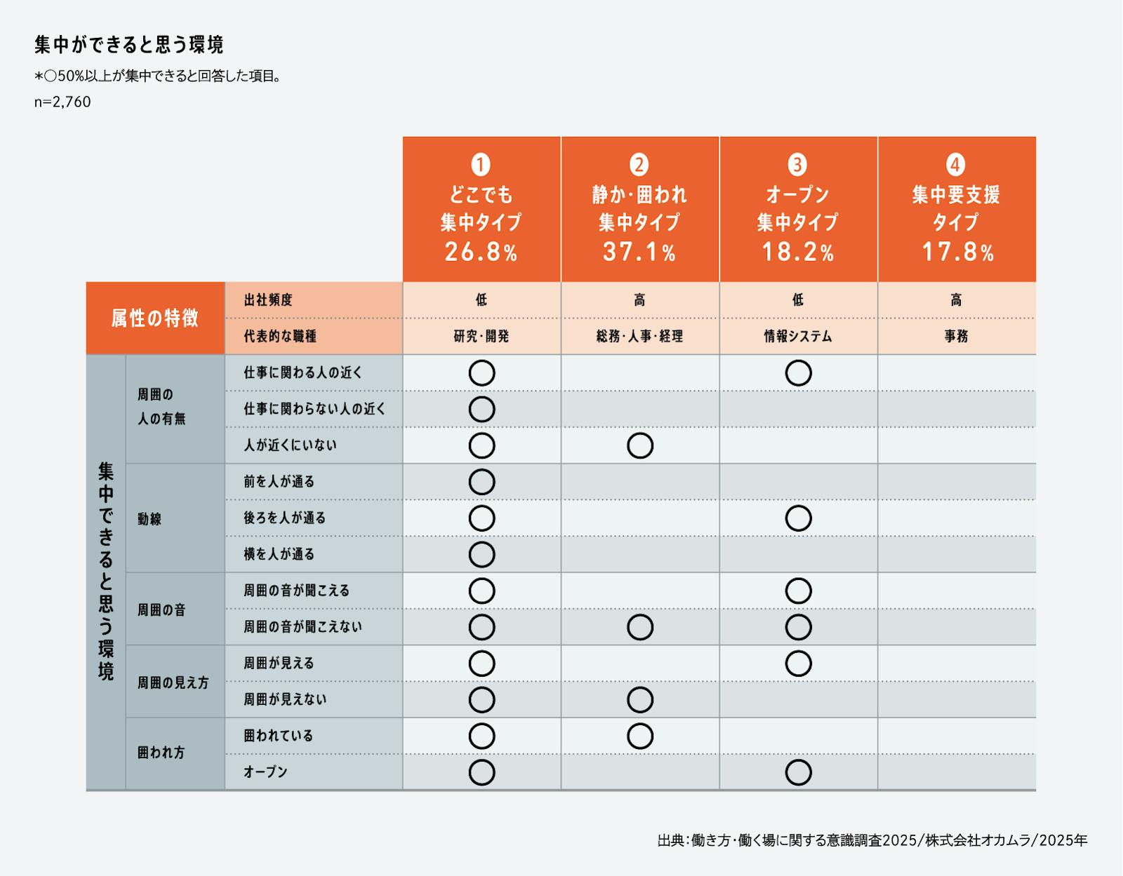 さらに、集中できる環境のタイプは4つに分類できました。①どんな環境でも集中ができる、②静かで囲われた環境の方が集中できる、③オープンな環境の方が集中できる、④提示したどんな環境でも集中ができない、の4タイプです。