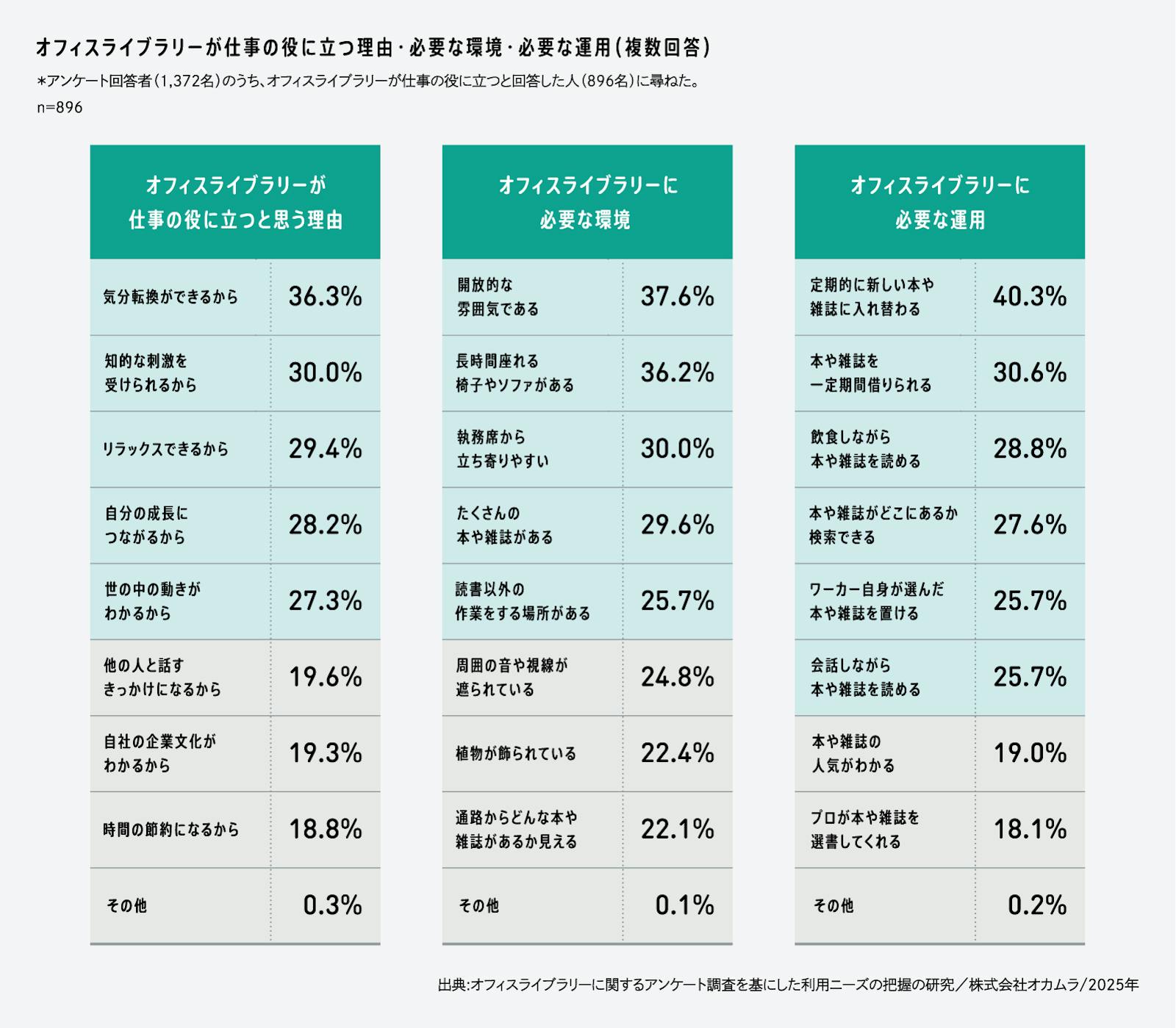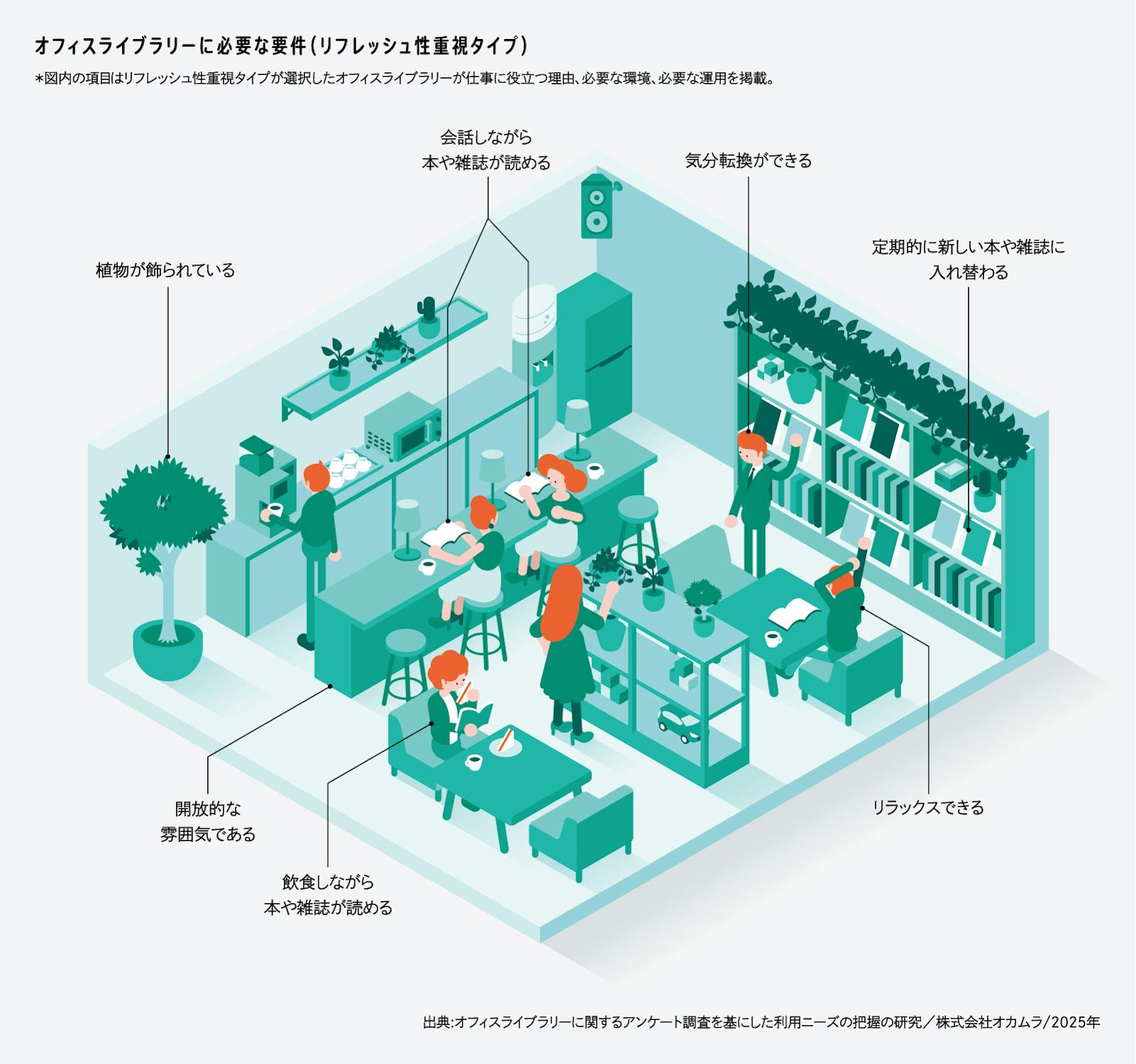 また、「定期的に新しい本や雑誌に入れ替わる」運用も選ばれていますが、気分転換が目的だと考えると、本の内容は業務と無関係でもよさそうです。