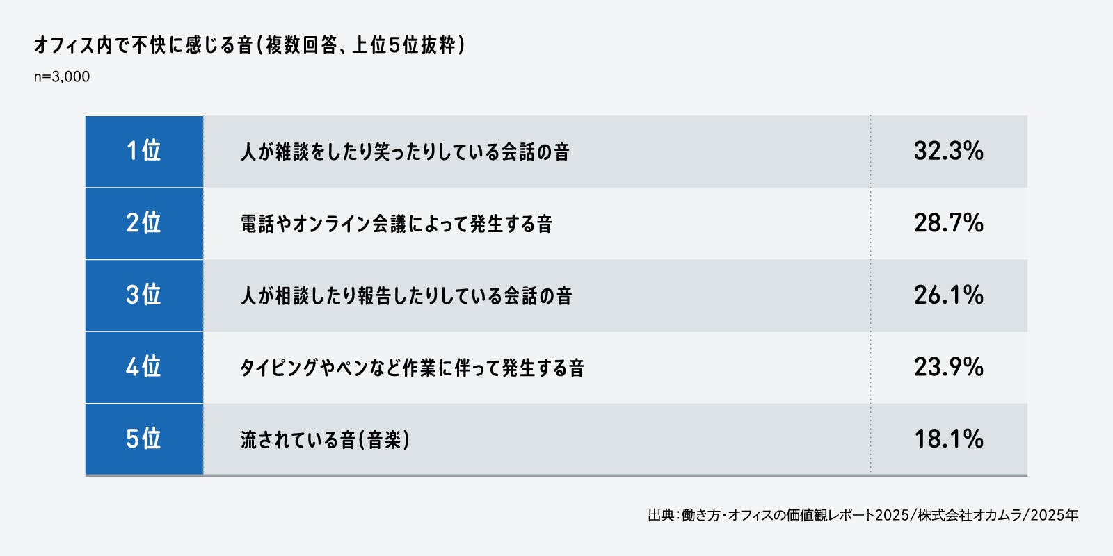 近年、かつてよりもオフィスは静かになっています。たとえば、機器の進化によって動作音が削減され、携帯電話の普及により固定電話の着信音が鳴ることは減りました。だからこそ、会話などの音声やちょっとした雑音が耳につくようになり、音に敏感になっている人もいるのではないでしょうか。実際に、オフィス内で不快に感じる音を調査すると、最も回答者の割合が多い項目は「人が雑談をしたり笑ったりしている会話の音」で、3割以上が不快と感じていました。
