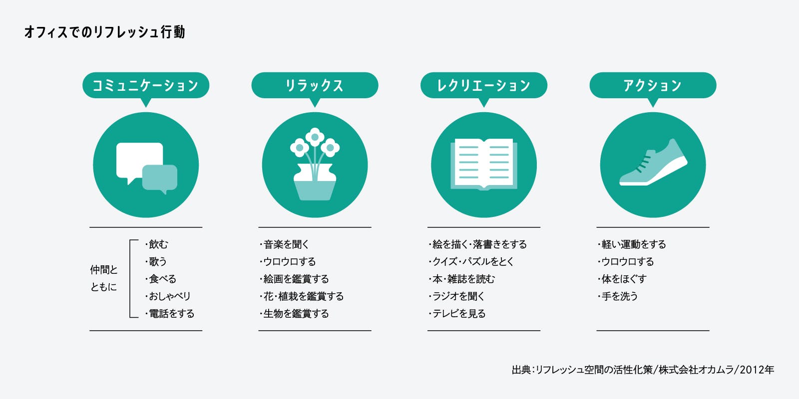 また、オカムラが行った調査では、オフィスでのリフレッシュ行動は「コミュニケーション」「リラックス」「レクリエーション」「アクション」の4つに分類できることがわかりました。「コミュニケーション」は、仲間との会話や飲食などを楽しむことによって精神的に安らぐ行動です。「リラックス」は、植物を見たり音楽を聴いたりするなど、何かを鑑賞しながら心身を休める行動を指します。「レクリエーション」は、雑誌を読むなど、仕事以外のことを考えながら気分転換する行動です。そして「アクション」は、オフィス内を歩くなどの軽く体を動かすような行動です。