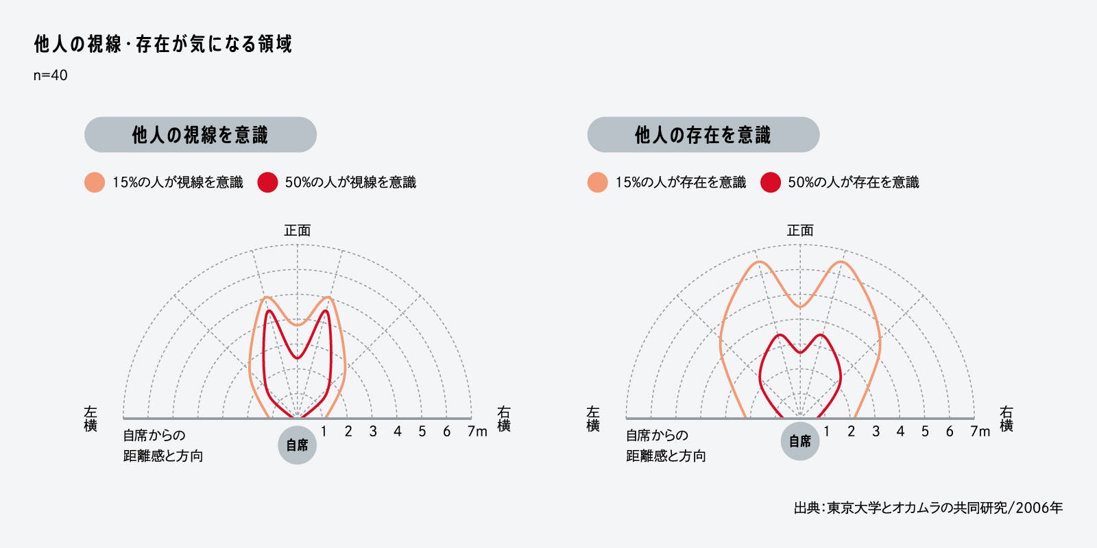 オカムラと東京大学は、対向型レイアウトの座席に座る人が、周辺のワーカーの視線や存在から受ける影響について調査しました。その結果、パソコン作業を想定した場合に、他者の「視線」が気になる領域よりも、他者の「存在」が気になる領域の方が広いことがわかりました。視線が自分に直接向けられていなくても、近くに誰かがいるだけで仕事のしやすさに影響を与えてしまうようです。