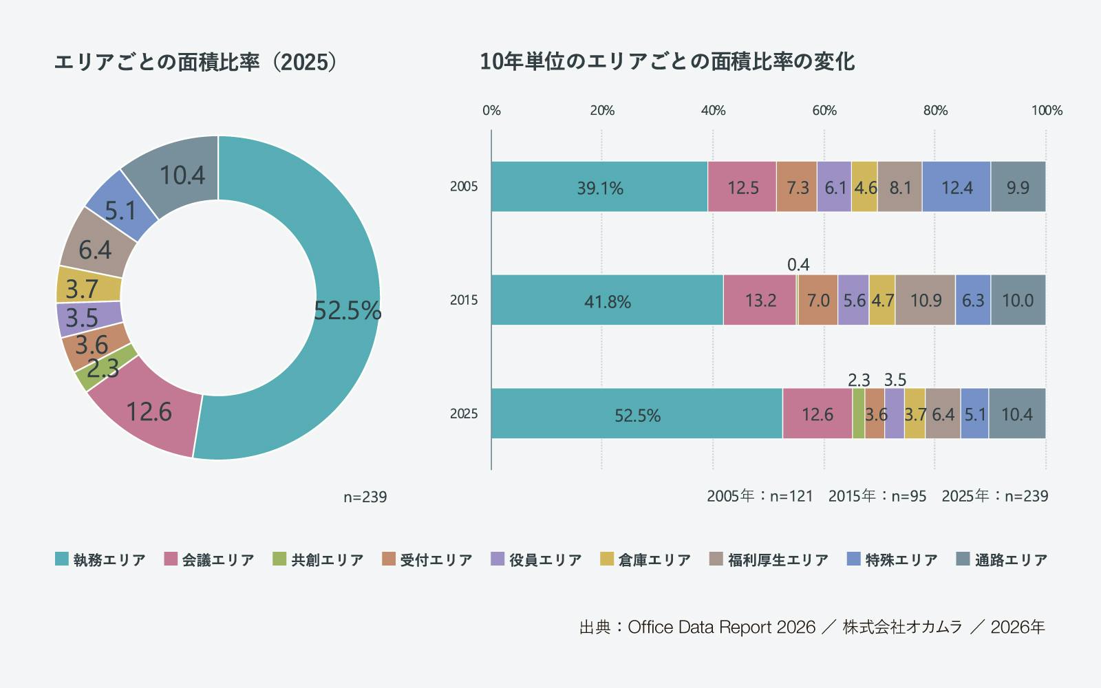このレポートでは、オフィス全体を9つのエリアに分類し、それぞれの面積を計測しています。エリアごとの面積比率を見ると、オフィス全体の約半分を執務エリアが占めています。また、10年ごとの変化を見ると、執務エリアは徐々に増加している一方で、受付エリアや役員エリア、特殊エリアの比率は減少しています。