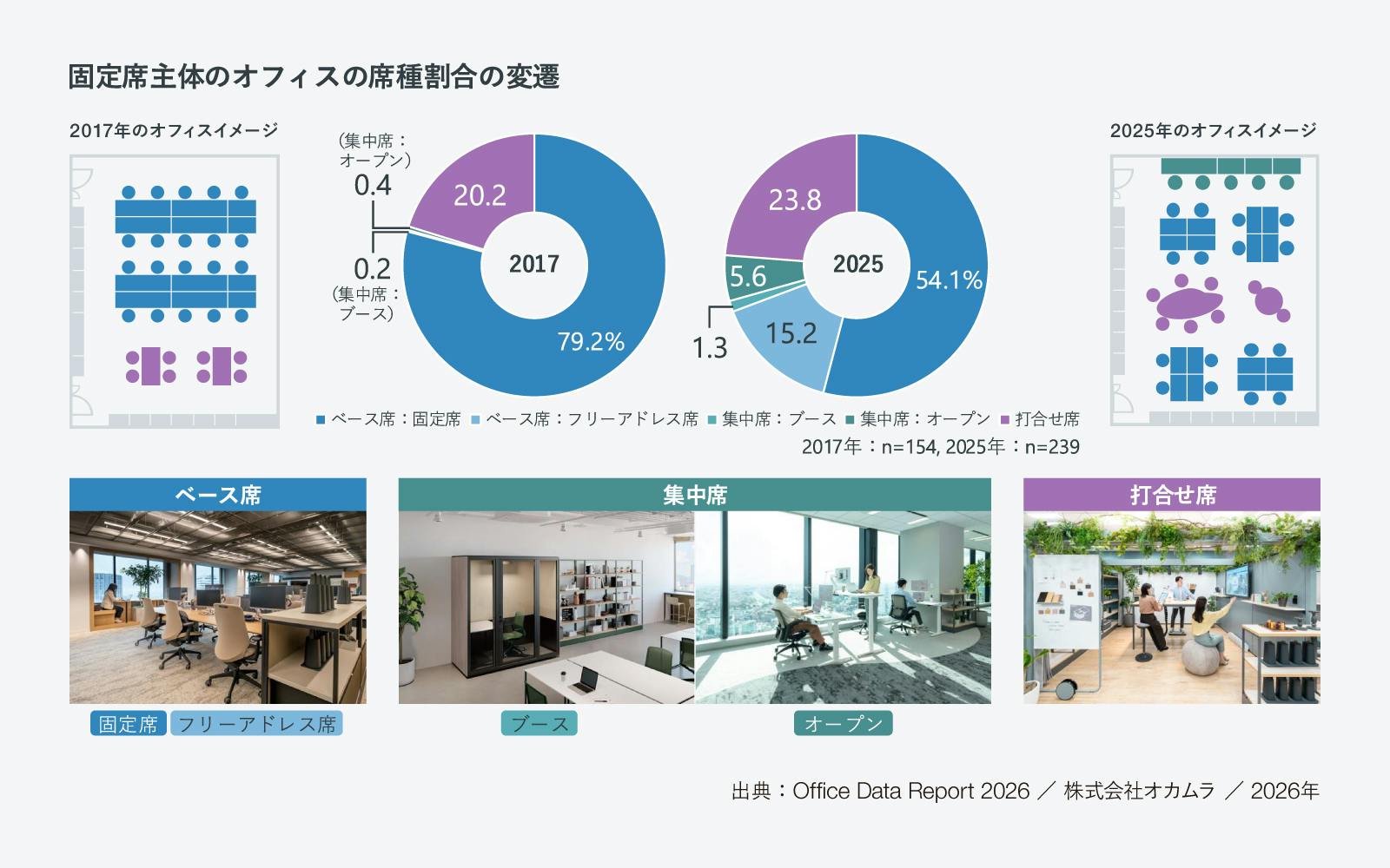 さらに、固定席主体のオフィスでの席種割合の変遷に注目すると、2017年と比較してフリーアドレス席や集中席、打合せ席などが増加していることが分かります。自分の拠点として使用するベース席以外でも働くことができるような場所や席が設けられており、固定席主体のオフィスでも多様な働き方を実現できる環境へと変化していると考えられます。