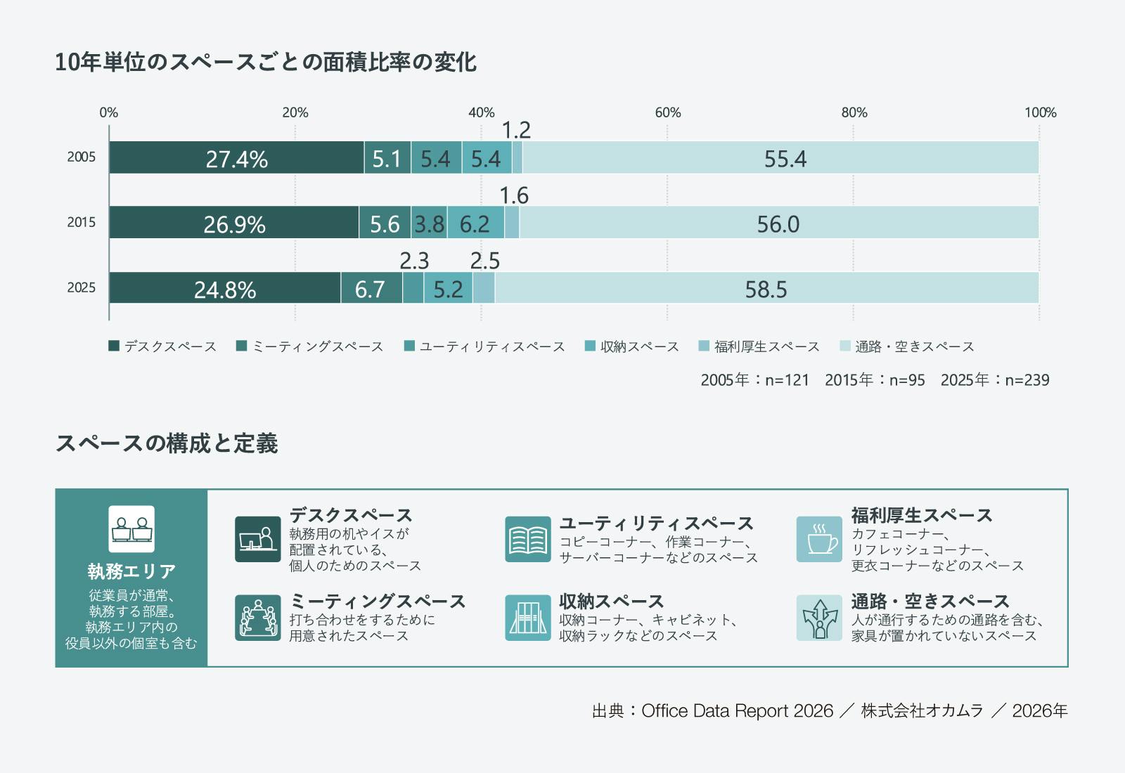 次に、執務エリア内の各スペースの面積比率について紹介します。オフィスの主要な機能である執務エリアは、6つのスペースに分けて面積を計測し、スペースごとの比率を算出しています。2005年から10年ごとにデータを比較したところ、最も大きな割合を占めている通路・空きスペースは徐々に増えており、執務エリアは徐々にゆとりのある空間になりつつあることが分かります。