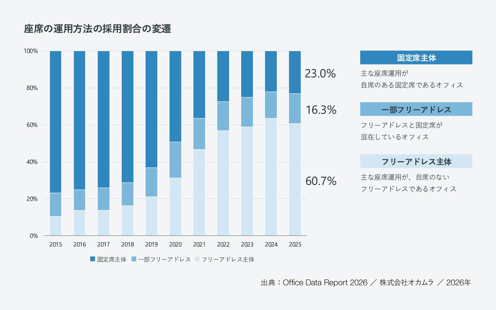 オフィスにおける座席運用方法の採用割合の変化を見ていくと、これまで固定席を採用するオフィスは減少傾向にありましたが、2025年は固定席を採用するオフィスの割合が微増し、フリーアドレスの割合はやや減少していることが分かります。