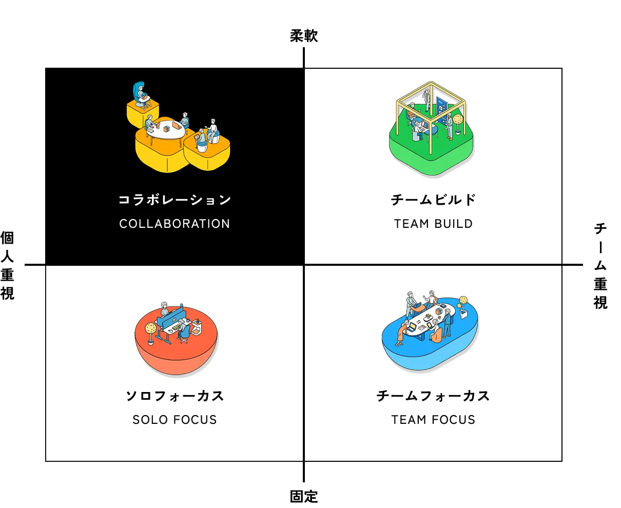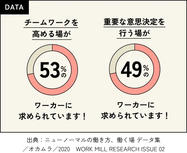 社内共創や部門を超えたコミュニケーションを幅広く行いつつ、しっかりと議論に集中する時間も必要なスタイル。シーンに合った「様々な集まり方」を選択しながら働きます。