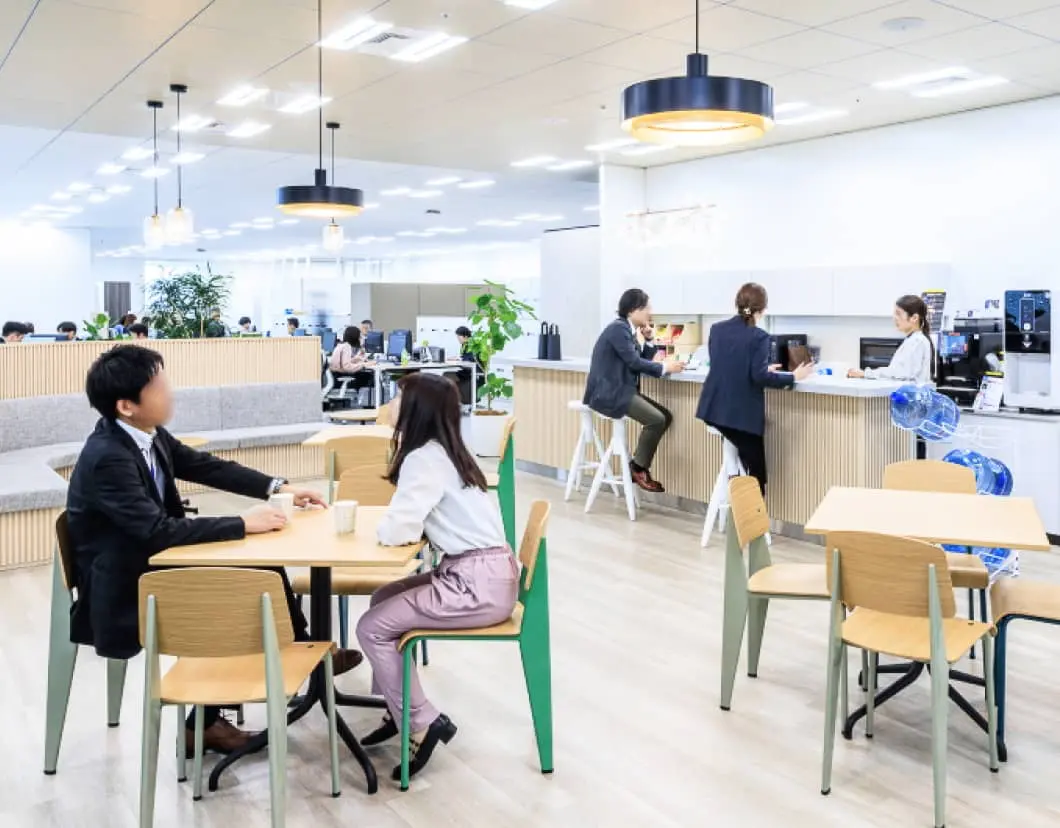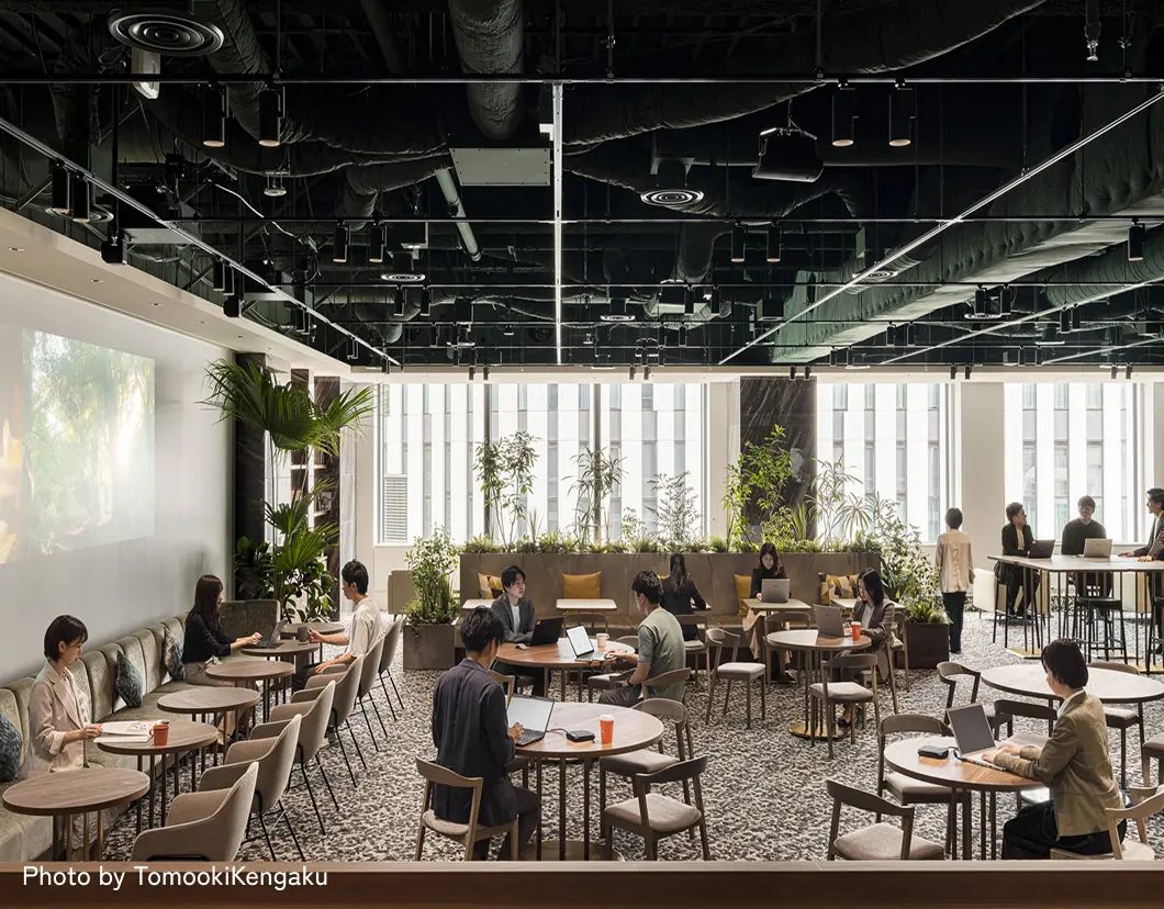 社内共創を活発にするうえで、日常的に部門を超えてワーカーが集まるよう、カフェ機能との併設やカジュアルな雰囲気づくりが有効です。また議論や発表などの様々な活動が行えるよう、キャスターテーブルで柔軟にレイアウトを変えられることも大切なポイントです。