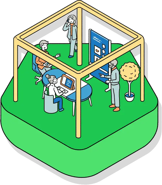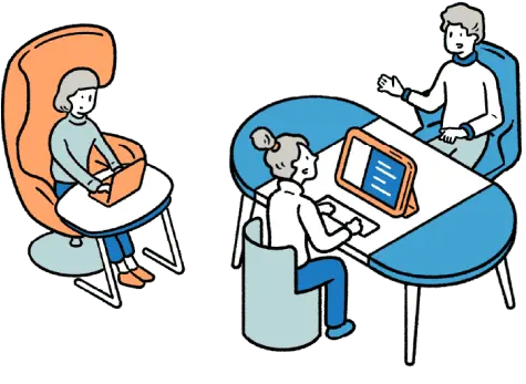 必要に応じてチームとコミュニケーションをとるために、チームの拠り所となる空間に顔を出します。ちょっとした相談や共同作業がはかどり、「自分の居場所」があることで安心感が感じられます。