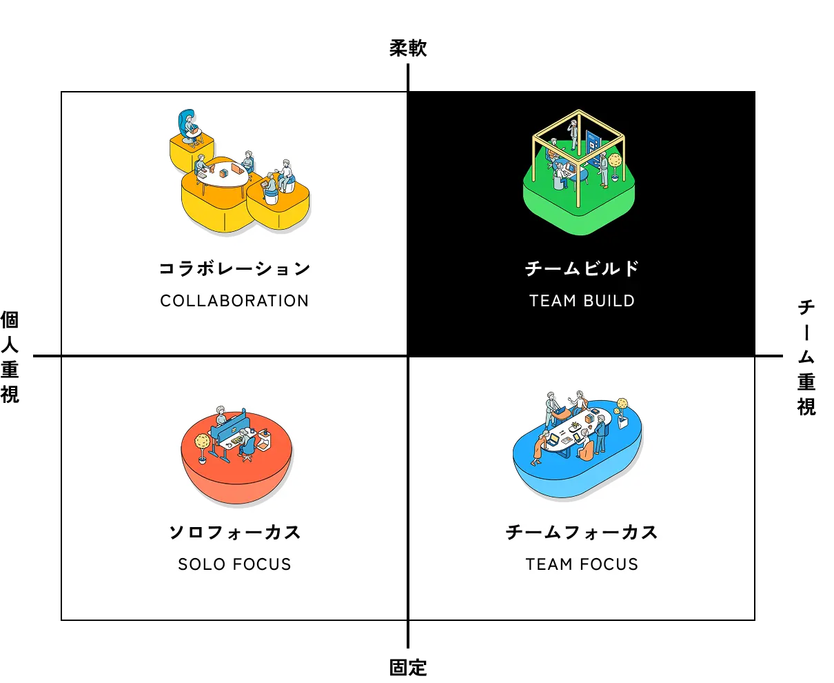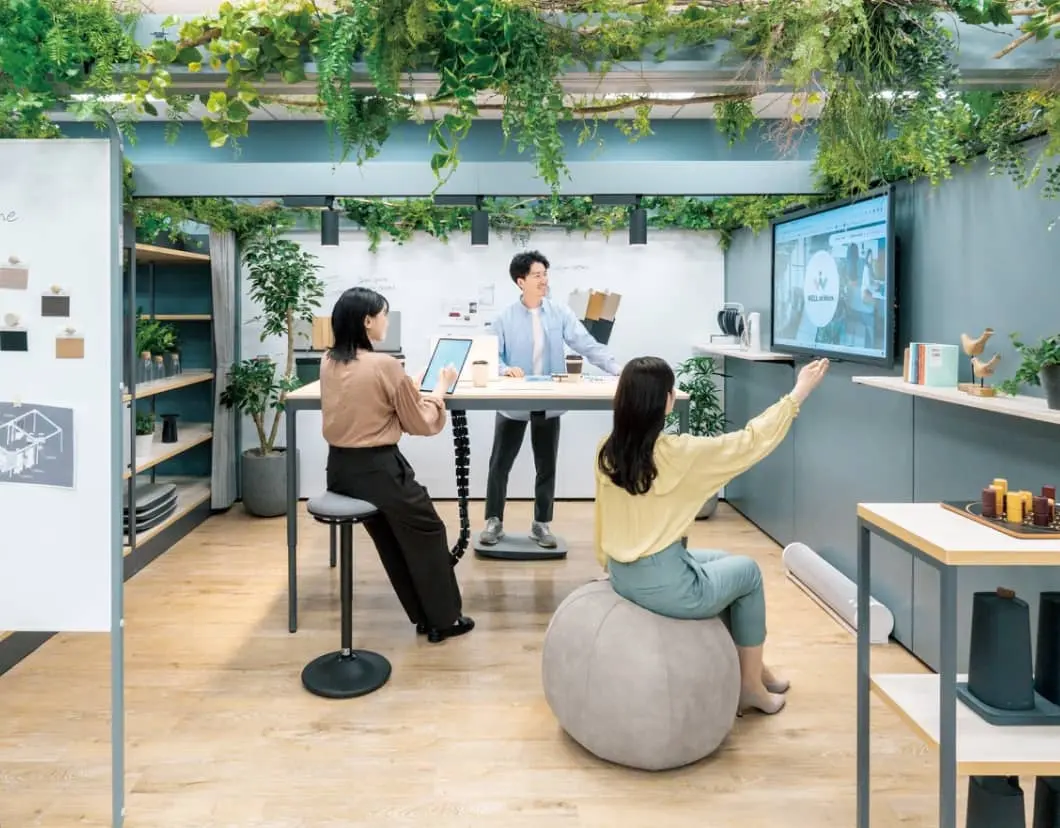 個人ワークとチームワークのメリハリも大切。ほどよく混ざりながら、家具などであえて変化をつけましょう。
