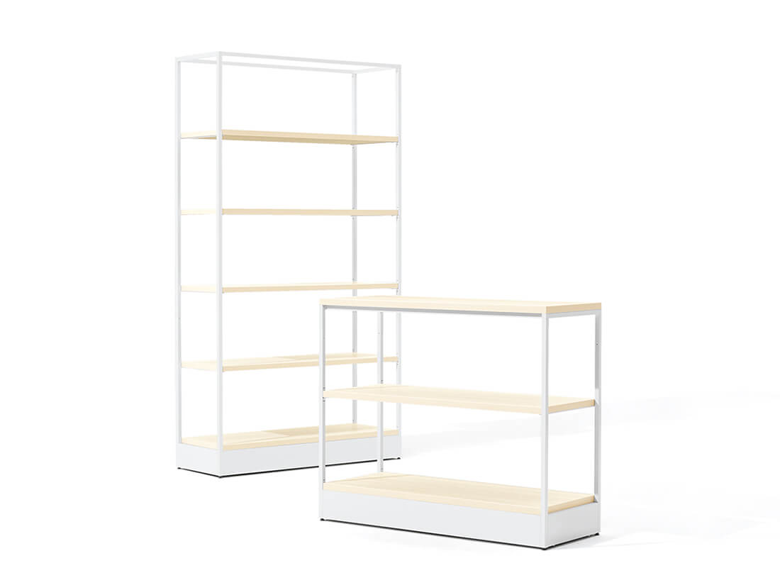 飾り棚や、空間をさりげなく仕切るパーティション として活用できる、使い勝手の良いシェルフです。フレームと棚板だけで構成されたシンプルな構造 なので様々な空間にフィットします。