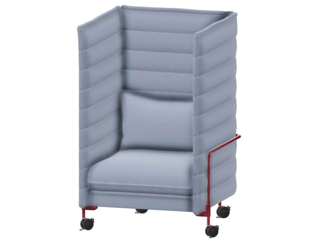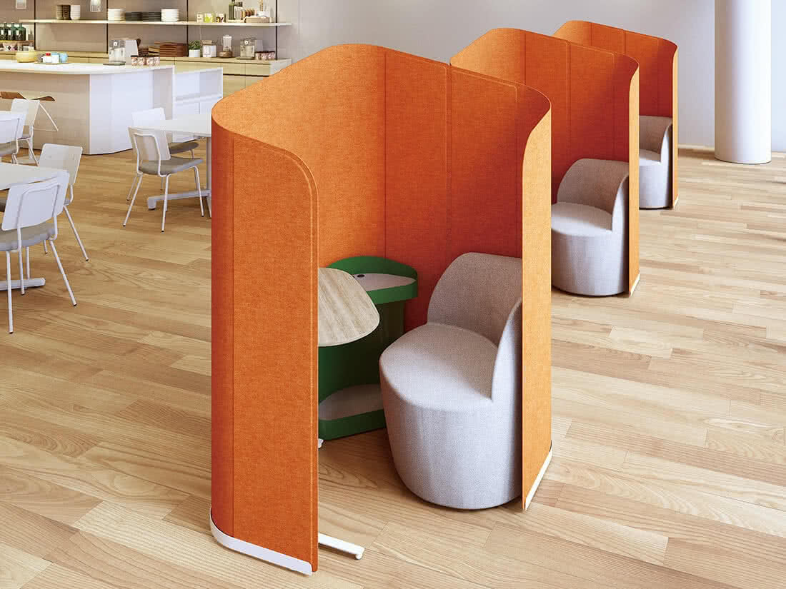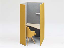 こもり空間の新しい形。再生材のフェルトで作られたパネルは驚くほど軽く、簡単に運べて、レイアウト変更も自由自在。柔らかい曲線で優しく切り取られた空間は、コンパクトでありながら、航空機のビジネスクラスのブースのような快適なこもり感を実現。