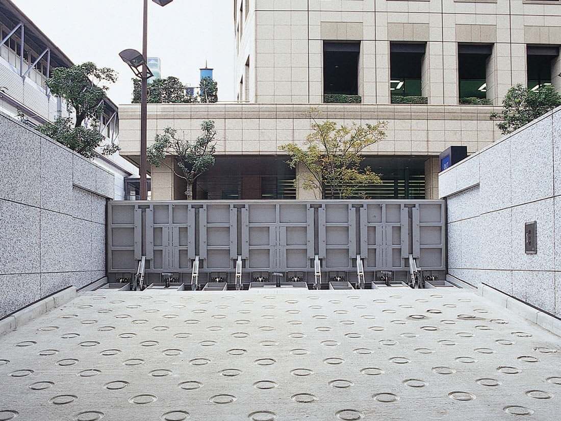 電動アクチュエーターを採用した電動起上式防水板。スイッチ操作1つでスムースな動き、確かな止水性能を実現します。