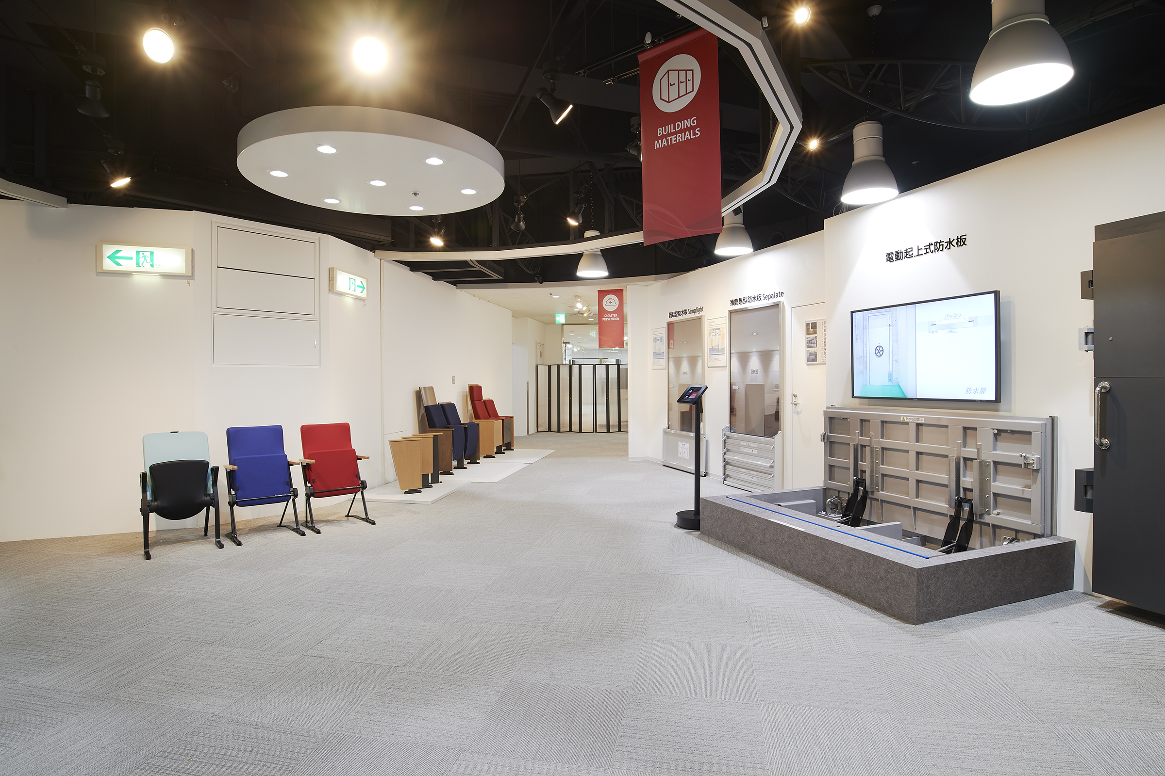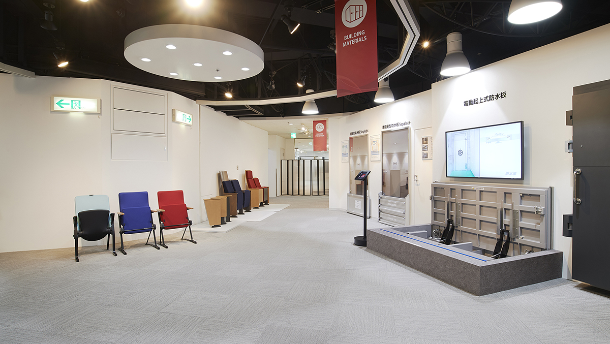 ホールエリアではハイグレードで洗練された劇場・ホール空間を実現するためのホール椅子を展示しております。 建材エリアは多彩な空間演出が可能なパーティションや快適で安全なトイレブースなど間仕切・建築内装製品を ご紹介します。また、オフィスや施設の安全を水害から守る防水扉や防水板もご覧いただけます。