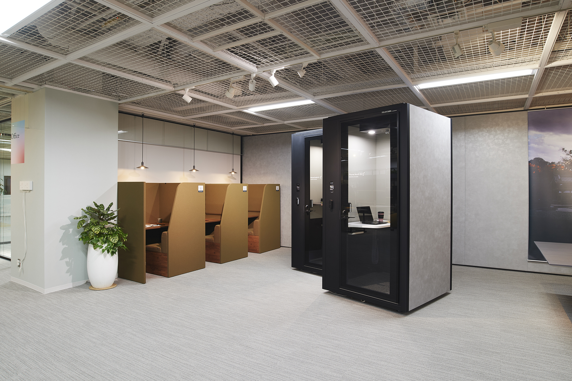 床・壁・天井すべての面が囲われた個室空間。遮音、吸音、照明、換気の各機能が室内の快適性を高め、これまでにない集中環境をもたらします。また防火性に十分配慮された仕様となっており、大掛かりな設備工事を必要とせずに、従来の家具と同様の扱いで設置が可能です。