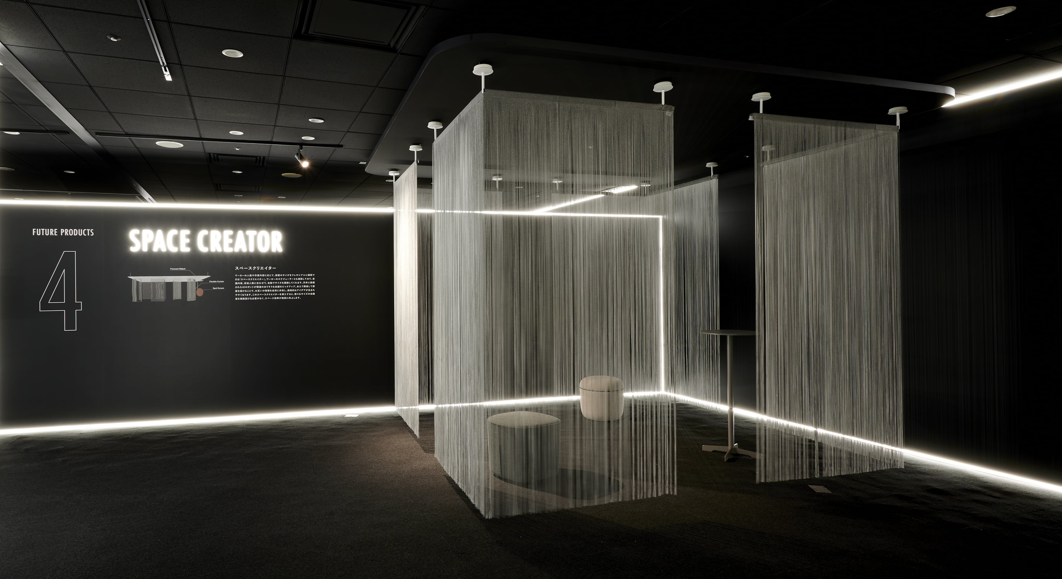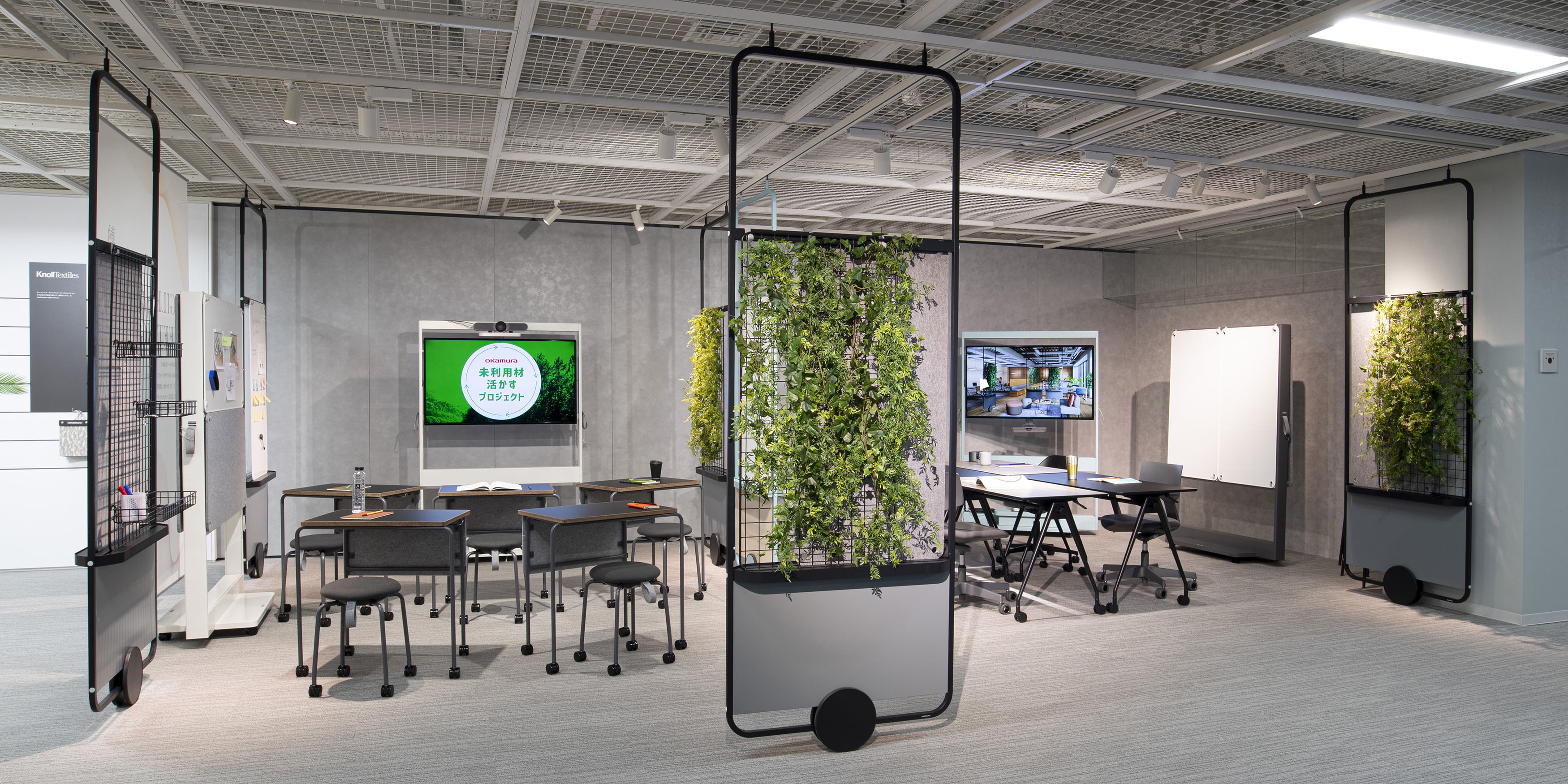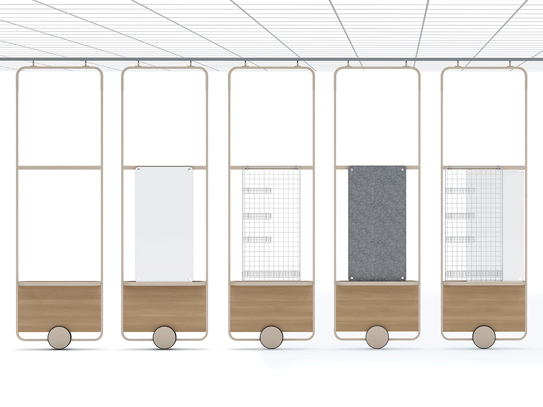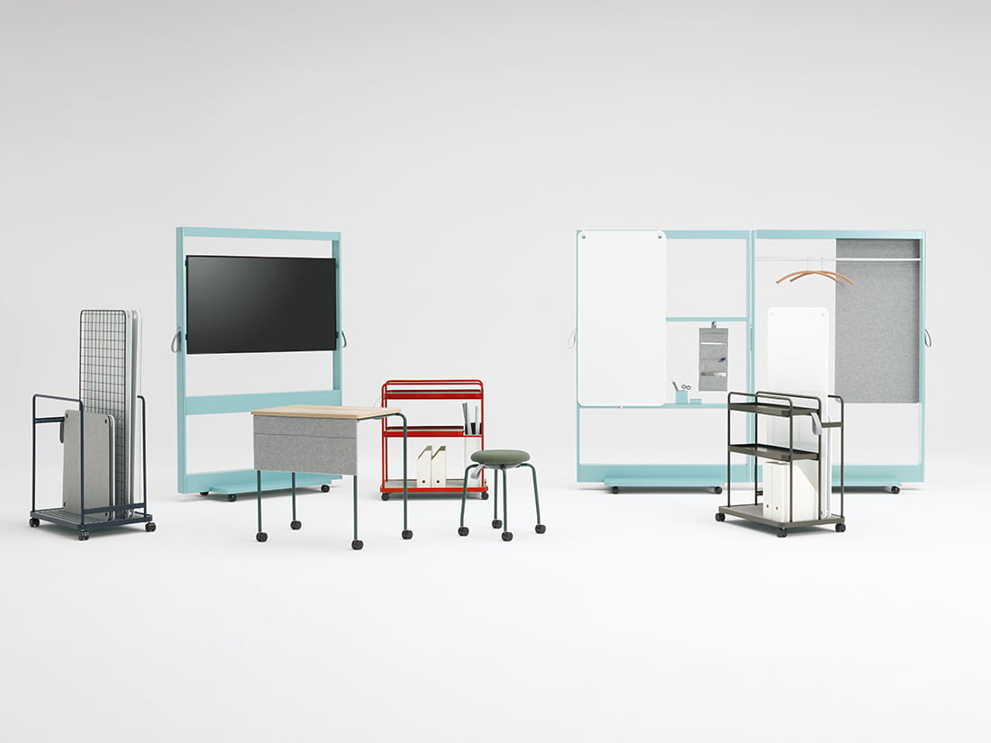 ゆるやかに仕切るユーティリティースライドパネル。アール形状のフレームによるカジュアルデザイン、大型の1輪キャスターで軽快な移動が可能です。チーム作業に合わせ空間を自由に変化させることで、機能的なエリアを創り出します。
