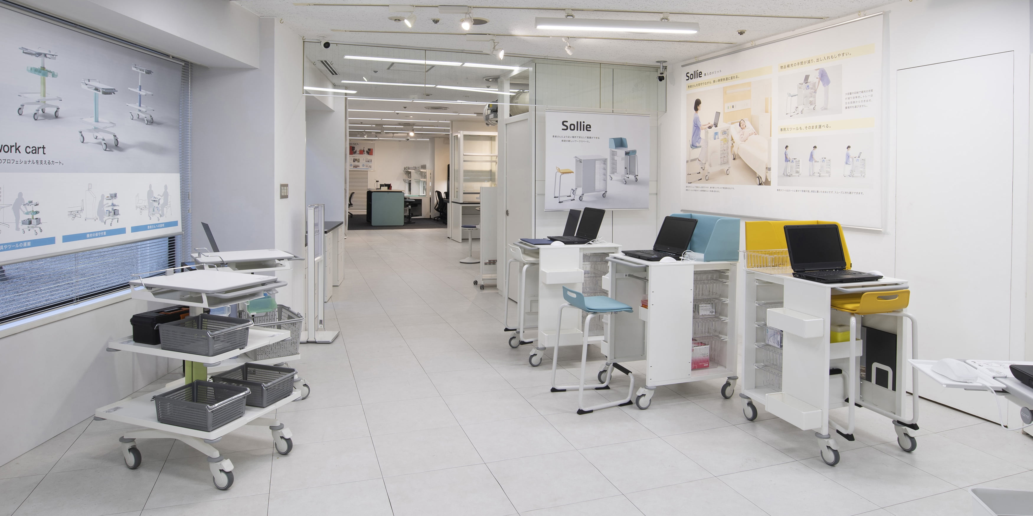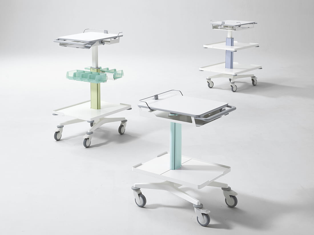 ナースカート・カレをベースに、病院内の様々な医療従事者の業務を支援する、幅広いサイズの物品の「搬送・作業」に特化したカートです。オプションの組み換えで既存のカレからも転用ができ、柔軟な運用が可能です。