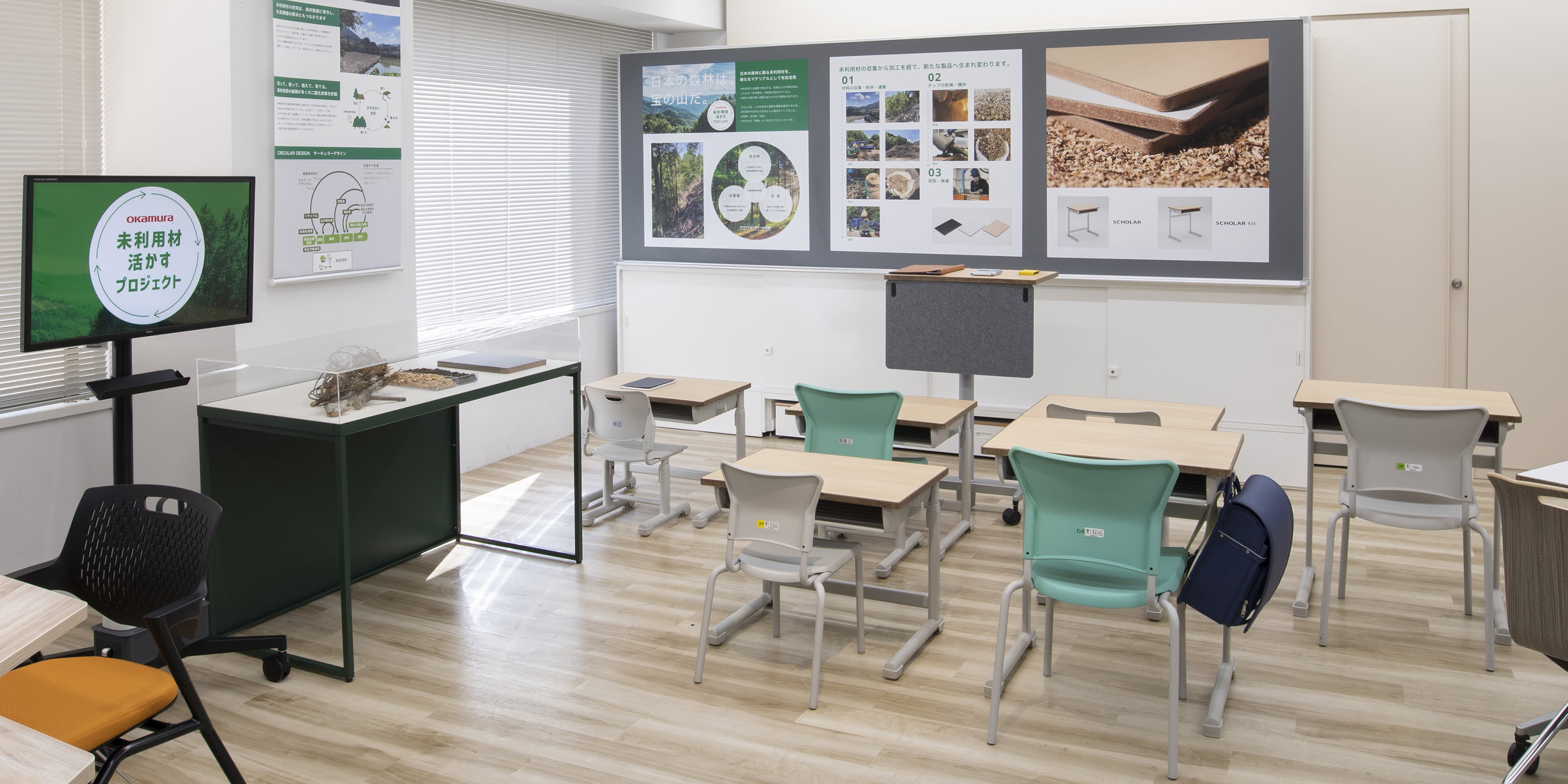 森林整備時に発生する切り捨て材等の未利用材を回収し、活用することは社会課題の解決にもつながります。今回オカムラはこれをチップに砕き、成型して天板に活用しました。未利用材天板製品は3アイテムでの展開です。