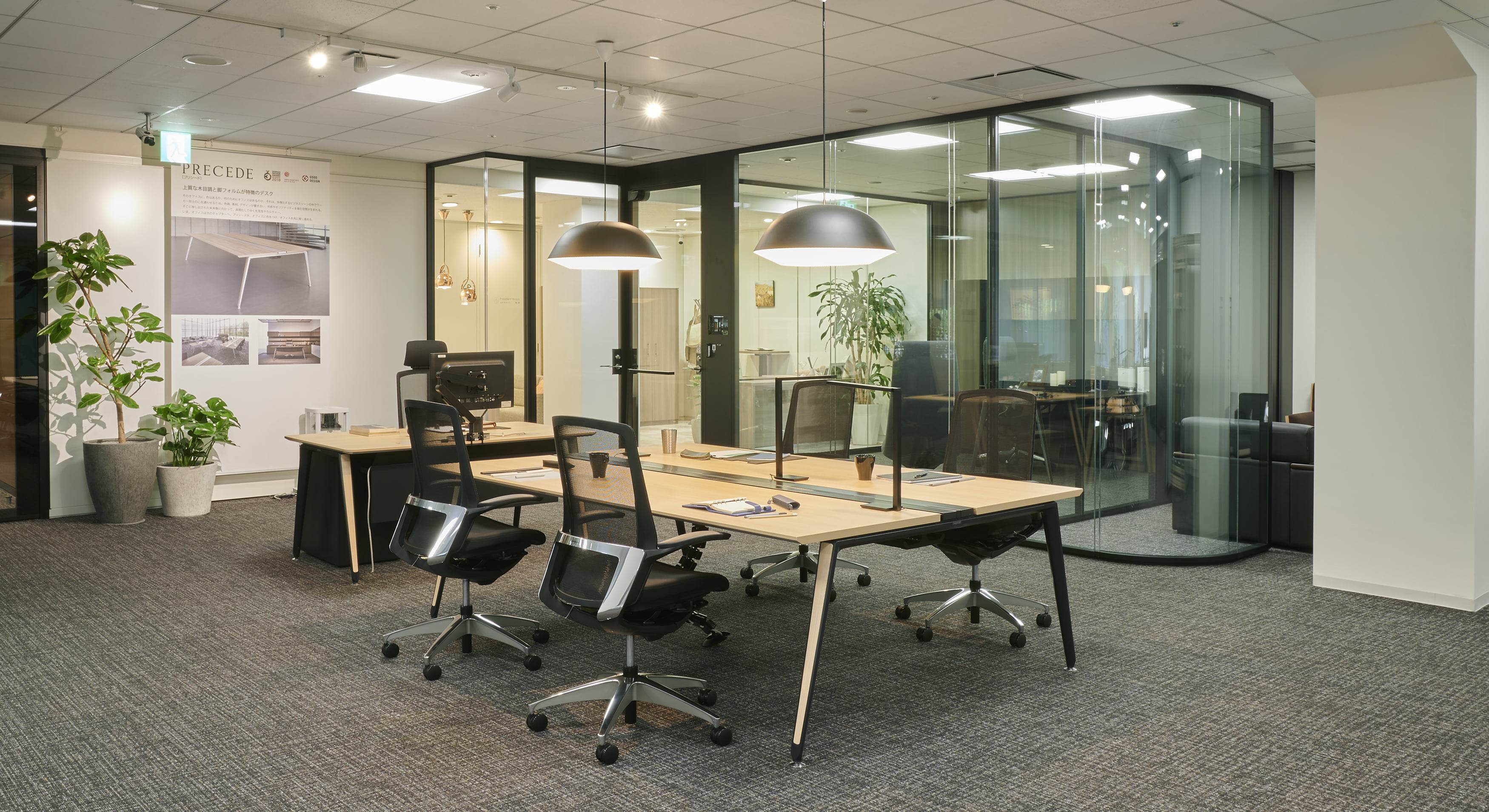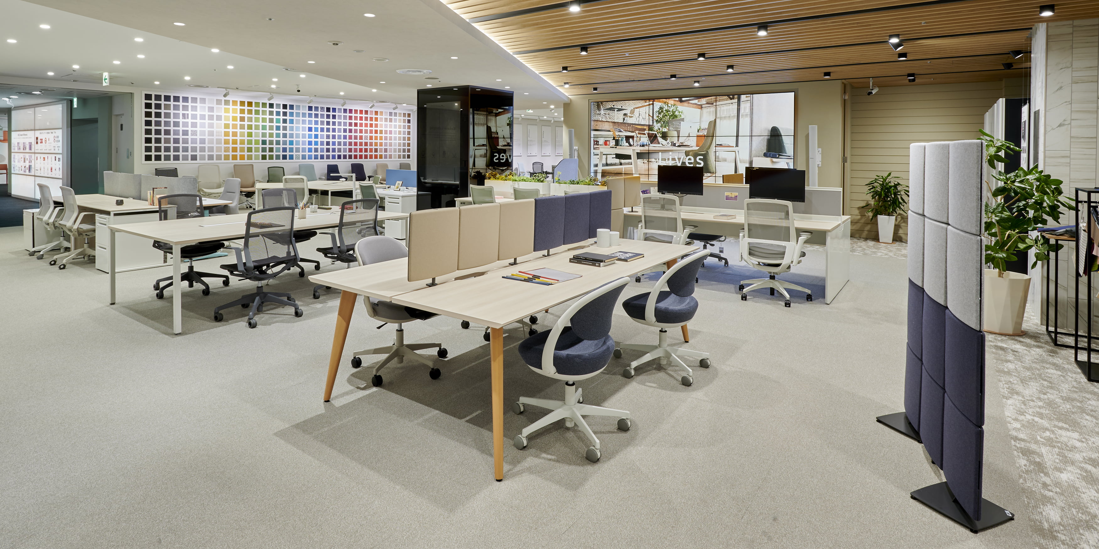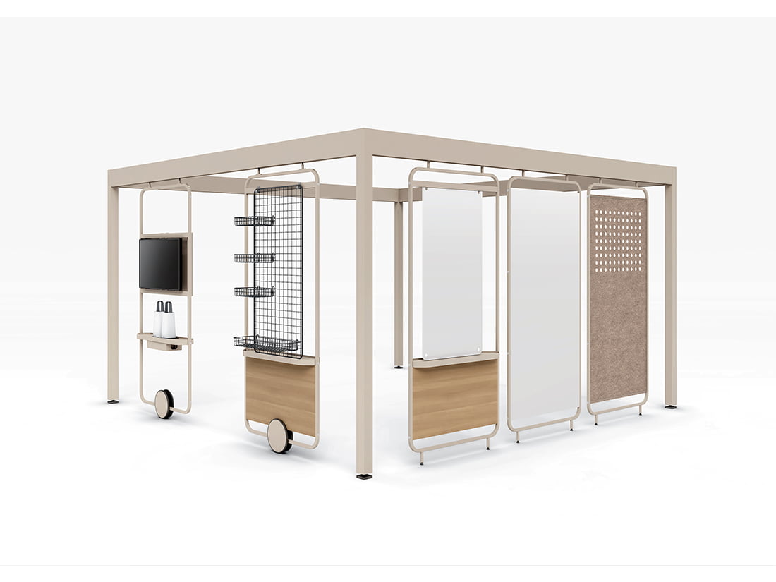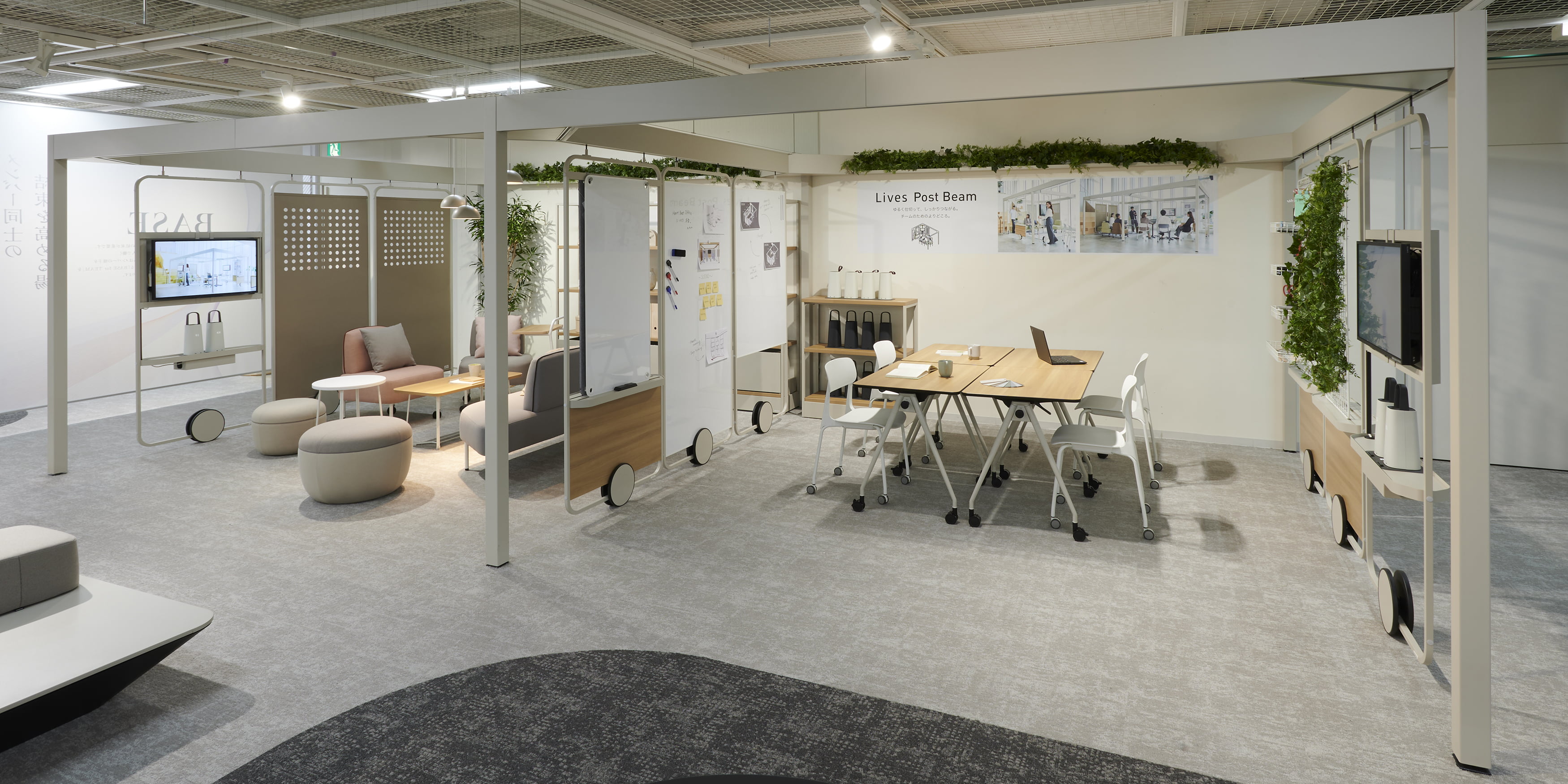 ルーム・イン・ルームの設えで、空間にあわせて様々なカラー展開ができるポストビーム。ビームに設置できる多彩なパネルにより、快適な「チームビルディング」を実現します。