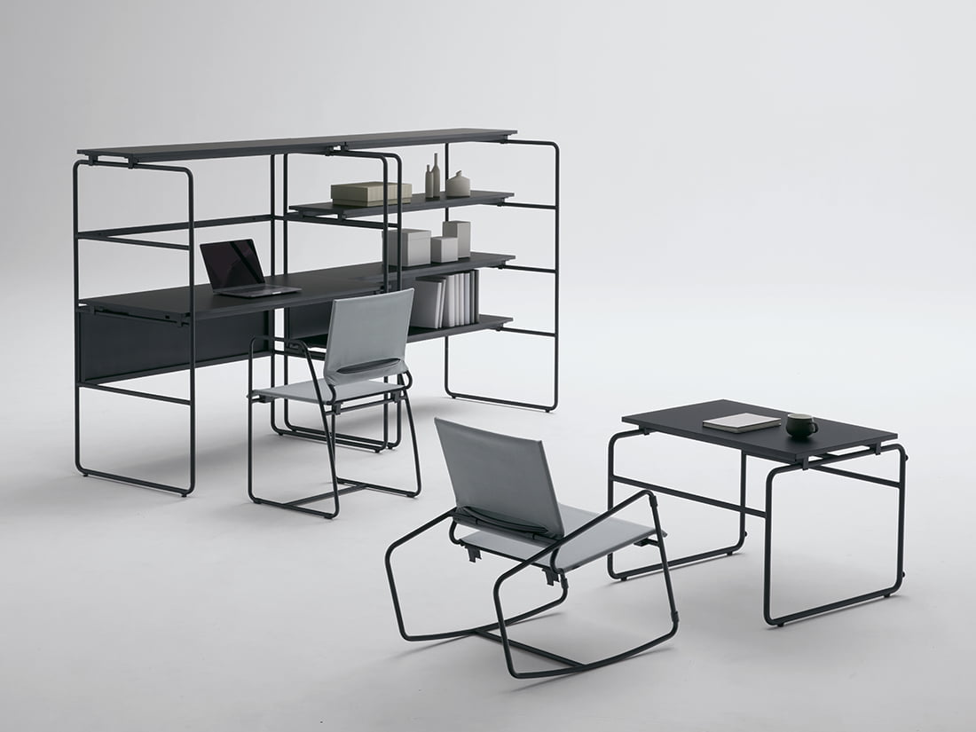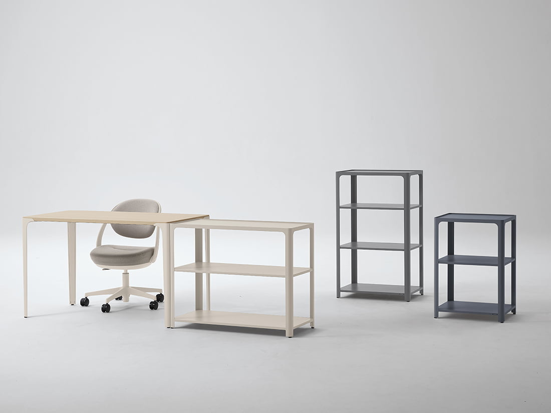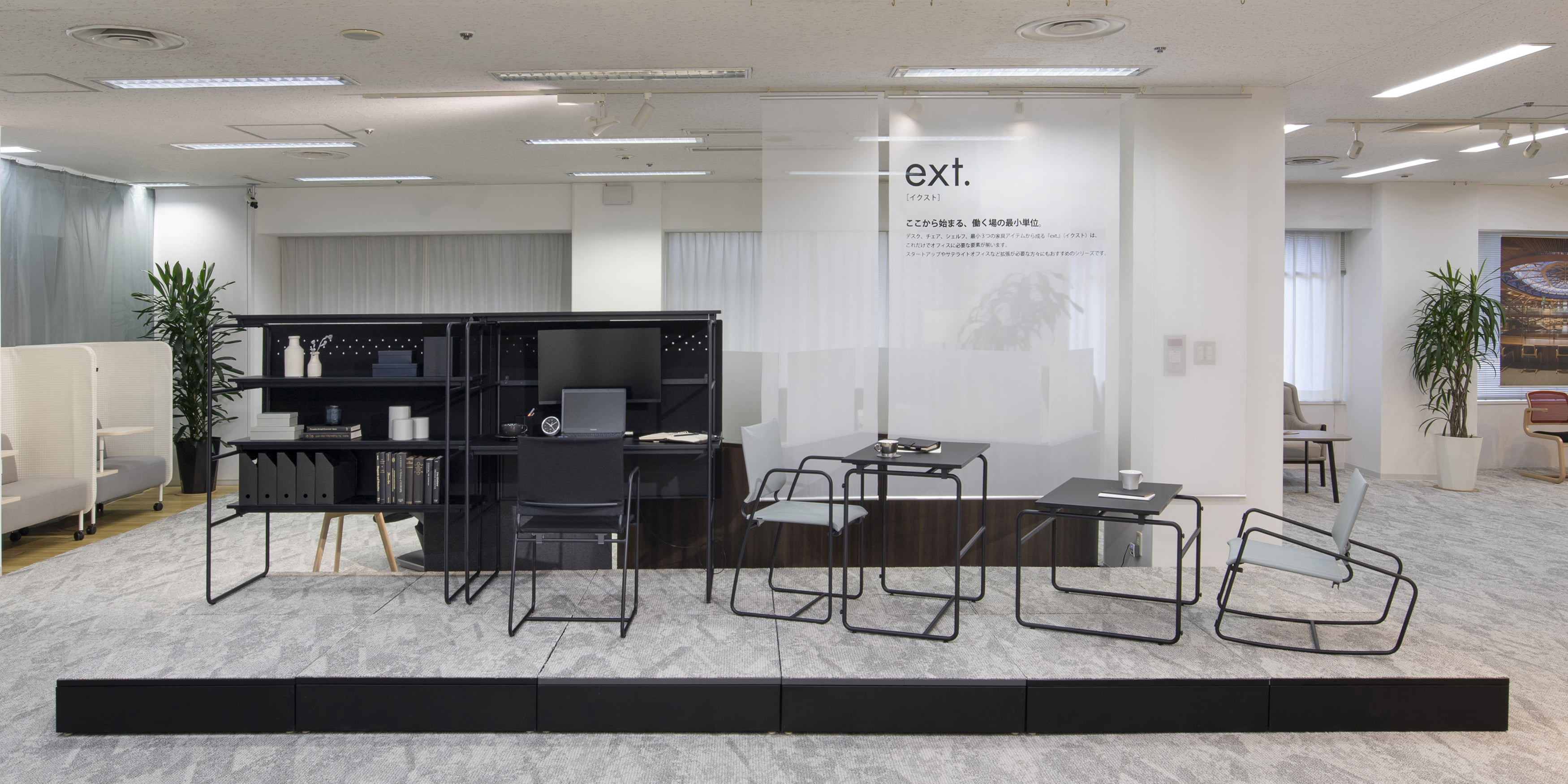 デスク、チェア、シェルフ、最小3つの家具アイテムから成る『ext.』は、これだけでオフィスに必要な空間が全て揃います。スタートアップやサテライトオフィスなど拡張が必要な方々にもおすすめのシリーズです。