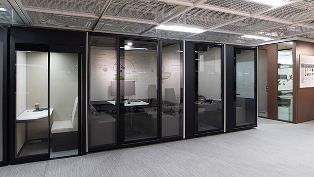 防音性に優れたインテリアウォール。パーティションにデスクや棚や照明などをアタッチメントでき、必要な機能を取り込んでより快適なはたらき心地をサポートする空間を演出します。
